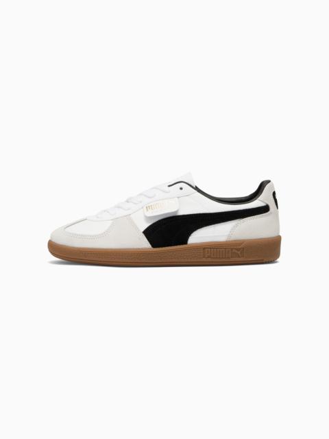 PRODUCT STORY Straight from the archives, it’s the PUMA Palermo. This classic terrace shoe is revived today with its signature T-toe construction, plus extra-bold colorblocking and plush materials. Its design builds on PUMA’s heritage within soccer, while appealing to today’s sneakerheads and terrace fashion mavens. FEATURES & BENEFITS - PUMA’s leather products support responsible manufacturing via the Leather Working Group. www.leatherworkinggroup.com DETAILS - Style: 396464_28 - Color: PUMA White-Chocolate Brown-Gum - Low boot - Lace closure - PUMA branding details - Suede PUMA Formstrip - Synthetic leather tongue, eyestay and quarter panel underlay MATERIAL INFORMATION - Midsole: 100% Synthetic - Sockliner: 100% Textile - Outsole: 100% Rubber - Upper: 82.49% Leather - cow, 17.51% Synthetic - Lining: 60% Textile, 40% Synthetic