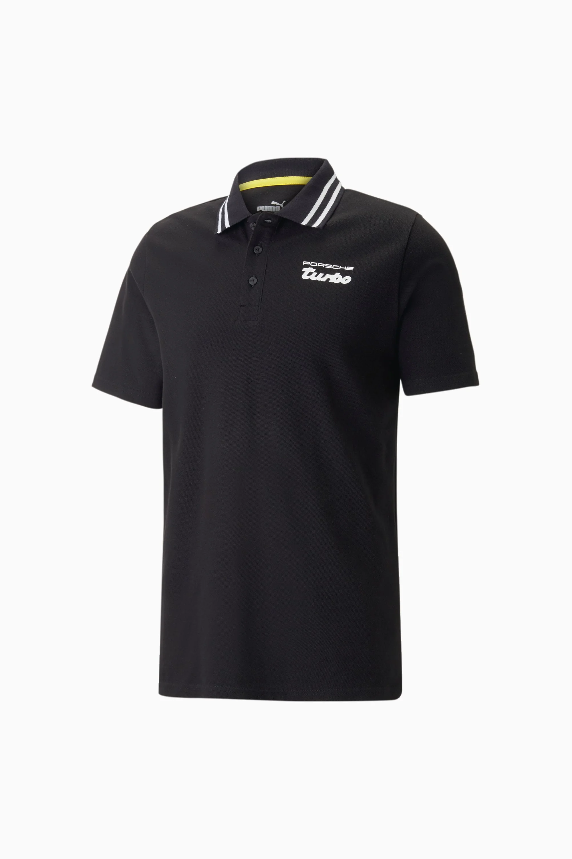 PRODUCT STORY Pay homage to one of the most iconic cars in history, the Porsche Turbo, with this Porsche Legacy polo shirt. It has a retro athletic look and details that nod to the Porsche Turbo throughout – including a silhouette of the car at the hem. FEATURES & BENEFITS - Recycled Content: Made with at least 20% recycled material as a step toward a better future - Cotton: Cotton in PUMA products comes from farms with a focus on sustainable farming such as water efficiency and soil health protection. Learn more: PUMA.com/forever-better DETAILS - Style: 538235_01 - Color: PUMA Black - Regular fit - Polo collar with button closure - Contrast stripes on the collar - Porsche Legacy branding on the chest, back, and hem MATERIAL INFORMATION - SHELL: 100% cotton - COLLAR: 100% cotton