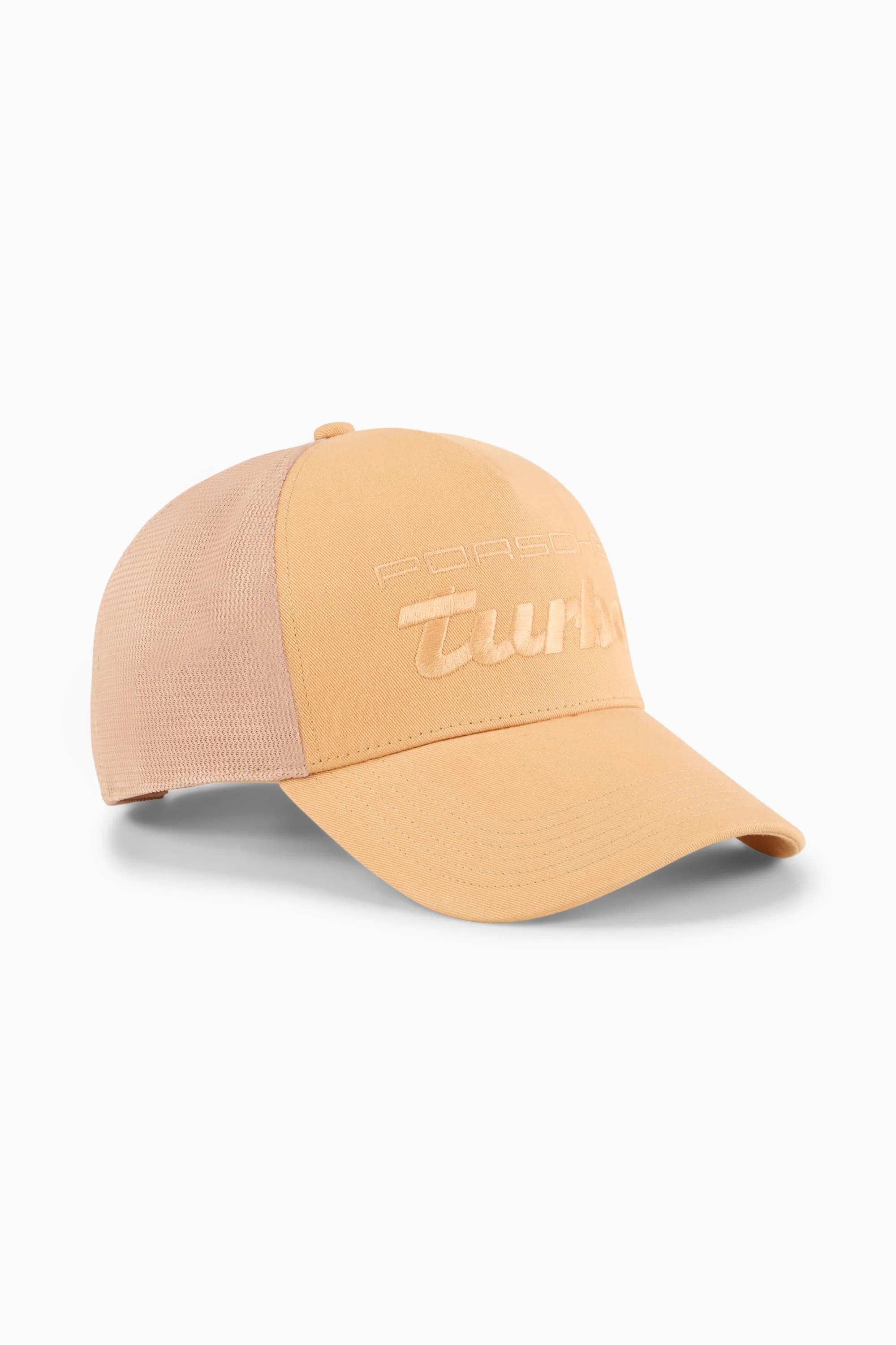 PRODUCT STORY Embrace your inner racer with premium Porsche Turbo embroidery and PUMA Cat logo. Featuring a snapback closure and premium mesh back, this cap combines style and function for the ultimate look. Perfect for those who live life in the fast lane. FEATURES & BENEFITS - Made with at least 50% recycled materials DETAILS - Style: 026096_03 - Color: Warm Beige - Trucker style cap - Premium mesh back - Snapback closure - Porsche Turbo embroidery and PUMA Cat logo - PUMA branding details MATERIAL INFORMATION - Back Panel: 100% polyester - Front Lining: 100% polyester - Front Panel: 100% cotton