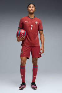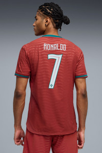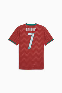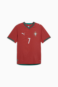 PRODUCT STORY Portugal’s Home Kit channels the energy of the ocean and the intensity of a team ready to make waves on the biggest stage. The iconic red base is layered with a wavy pattern and green accents, a nod to the country’s maritime roots and fearless spirit. It’s a design that speaks to those who were born to explore and live to play por amor a camisola. The match-ready, Authentic version of the jersey is made with PUMA’s ULTRAWEAVE fabric and features an athletic fit for elite-level performance. This version is embellished with players' names and numbers. FEATURES & BENEFITS - LIGHT: ULTRAWEAVE is PUMA’s ultra-light performance fabric engineered for unrestricted, natural movement - MOISTURE MANAGEMENT: Technical dryCELL fabrics wick moisture away from the skin to help keep you dry and comfortable - Made with at least 50% recycled materials. DETAILS - Style: 788140_77 - Color: Club Red-Green Lagoon - Pro Fit - Main material type: Dobby - Neck: Crew neck - Short sleeves - Mesh panels for ventilation - Embellished with the player name and number - Team and PUMA branding details MATERIAL INFORMATION - Inserts: 100% polyester - Shell: 50% polyester, 50% Elastomultiester - Rib: 97% polyester, 3% elastane