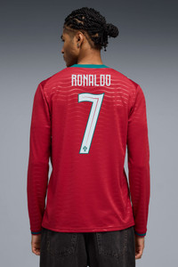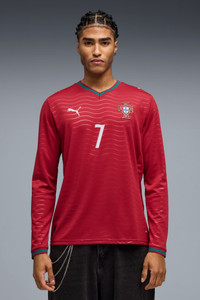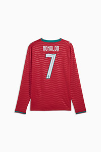 PRODUCT STORY Portugal’s Home Kit channels the energy of the ocean and the intensity of a team ready to make waves on the biggest stage. The iconic red base is layered with a wavy pattern and green accents, a nod to the country’s maritime roots and fearless spirit. It’s a design that speaks to those who were born to explore and live to play por amor a camisola. Designed for the fans, the long sleeve Replica jersey pairs the same match-worn look with a casual silhouette, details, and materials, ideal for both game day and everyday wear. This version is embellished with players' names and numbers. FEATURES & BENEFITS - MOISTURE MANAGEMENT: Technical dryCELL fabrics wick moisture away from the skin to help keep you dry and comfortable - Made with at least 90% recycled materials. DETAILS - Style: 788142_77 - Color: Club Red-Green Lagoon - Fit: Regular - Main material type: Double-face jacquard - Neck: Vneck - Long sleeves - Mesh panels for ventilation - Embellished with the player name and number - Team and PUMA branding details MATERIAL INFORMATION - Inserts: 100% polyester - Shell: 100% polyester - Rib: 97% polyester, 3% elastane
