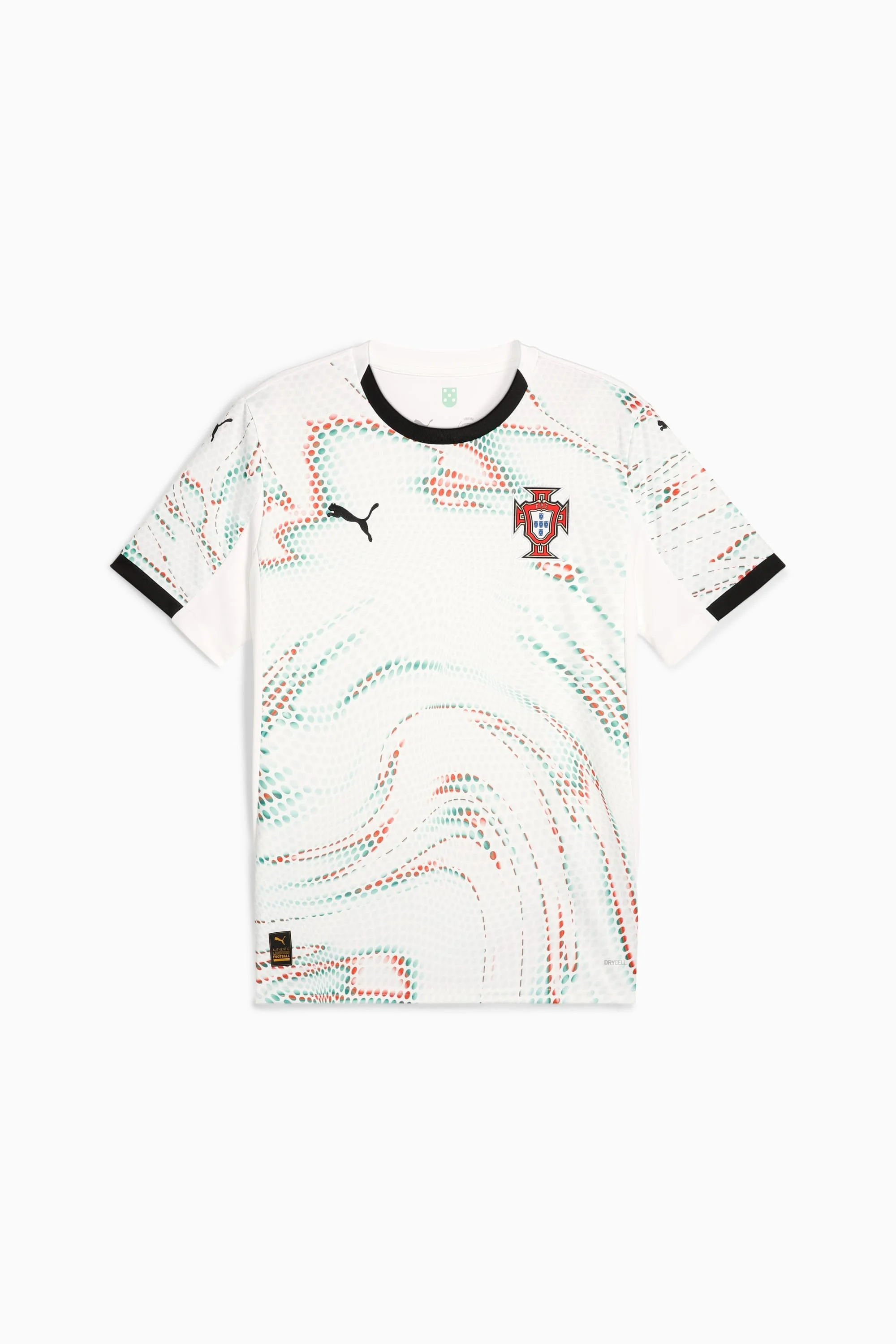 PRODUCT STORY The future shines brightly in the Portugal Away Kit. Bold graphics with red and green highlights are brought to life with motion to celebrate the intersection of art, technology, and soccer in modern-day Portugal. Designed for the fans, Replica jersey pairs the same match-worn look with a casual silhouette, details, and materials, ideal for both game day and everyday wear. This kit is made with RE:FIBRE, PUMA’s program to transform textile waste and other used materials into new textiles. FEATURES & BENEFITS - RE:FIBRE: Made of 100% recycled polyester, using polyester textile waste as the primary source of material - COMFORT: dryCELL sweat-wicking technology designed to keep you dry and comfortable DETAILS - Style: 779209_04 - Color: PUMA White-PUMA Black - Regular fit - Short sleeves - Crew neck - Curved side and underarm panels - Official national badge placed on left chest - PUMA Cat logo placed on right chest MATERIAL INFORMATION - SHELL: 100% polyester - RIB: 100% polyester