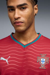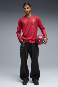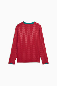 PRODUCT STORY Portugal’s Home Kit channels the energy of the ocean and the intensity of a team ready to make waves on the biggest stage. The iconic red base is layered with a wavy pattern and green accents, a nod to the country’s maritime roots and fearless spirit. It’s a design that speaks to those who were born to explore and live to play por amor a camisola. Designed for the fans, the long sleeve jersey pairs the same match-worn look with a casual silhouette, details, and materials, ideal for both game day and everyday wear. FEATURES & BENEFITS - MOISTURE MANAGEMENT: Technical dryCELL fabrics wick moisture away from the skin to help keep you dry and comfortable - As part of the RE:FIBRE program, this garment is made of at least 95% recycled material from textile waste and other used materials. DETAILS - Style: 783279_01 - Color: Club Red-Green Lagoon - Fit: Regular - Main material: Double-face jacquard - Neck: Crew neck - Long sleeves - Mesh panels for ventilation - Portugal badge - PUMA Cat logo MATERIAL INFORMATION - Inserts: 100% polyester - Shell: 100% polyester - Rib: 97% polyester, 3% elastane