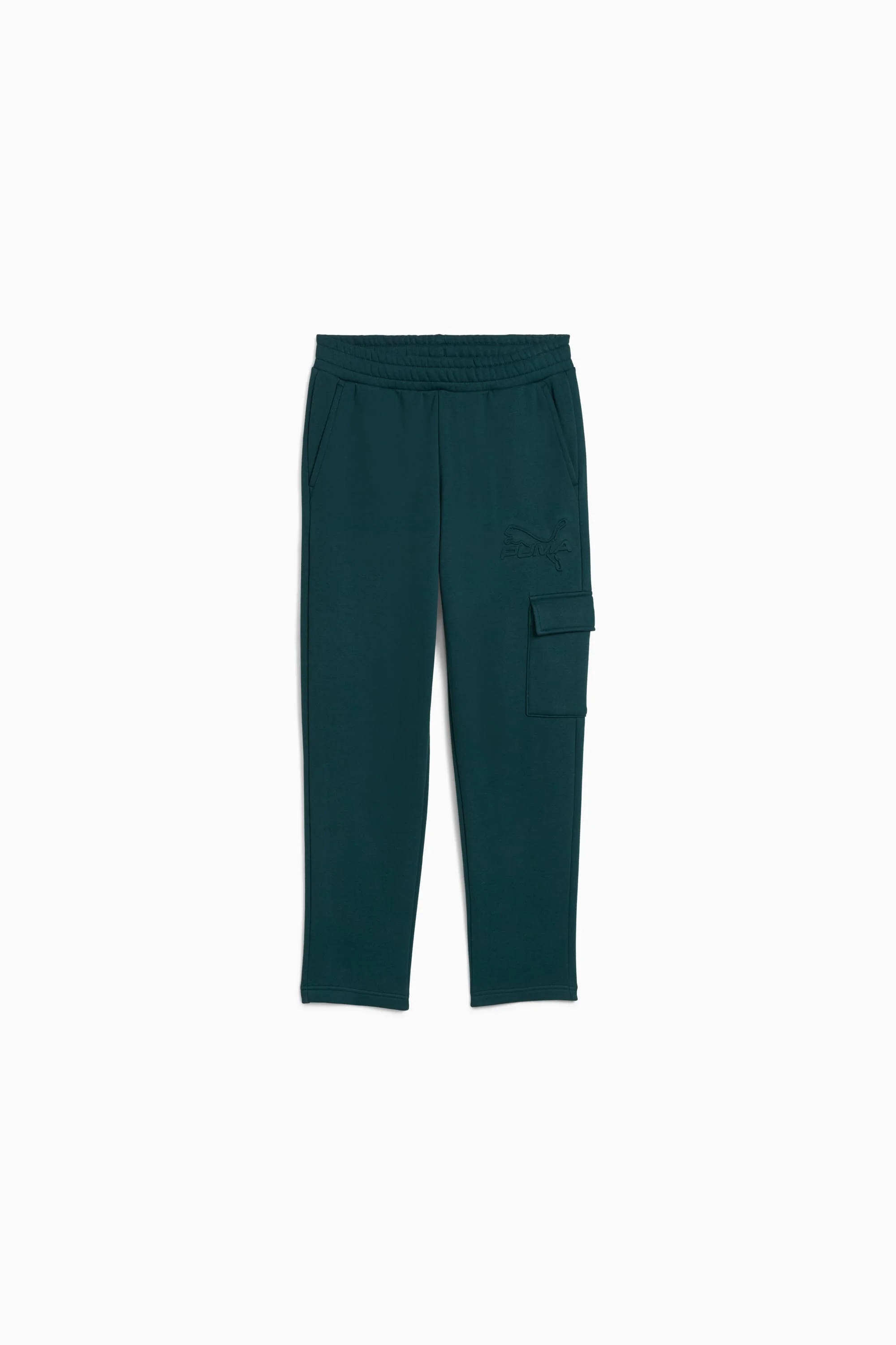 PRODUCT STORY Stylish, comfy, and always on point — PUMA Essentials are made for laid-back days. Whether you're lounging, grabbing a coffee, or on the go, these pieces provide the perfect mix of comfort and style. Simple, versatile, and designed to keep you feeling great all day long. FEATURES & BENEFITS - Made with at least 50% recycled materials DETAILS - Style: 690424_75 - Color: Green Terrain - Fit: Regular - Main Material: Fleece - Length: Regular - Rise: Medium - Pockets: Side Cargo Pockets - Ribbed waistband MATERIAL INFORMATION - Upper Pocket Bag: 100% cotton - Shell: 66% cotton, 34% polyester