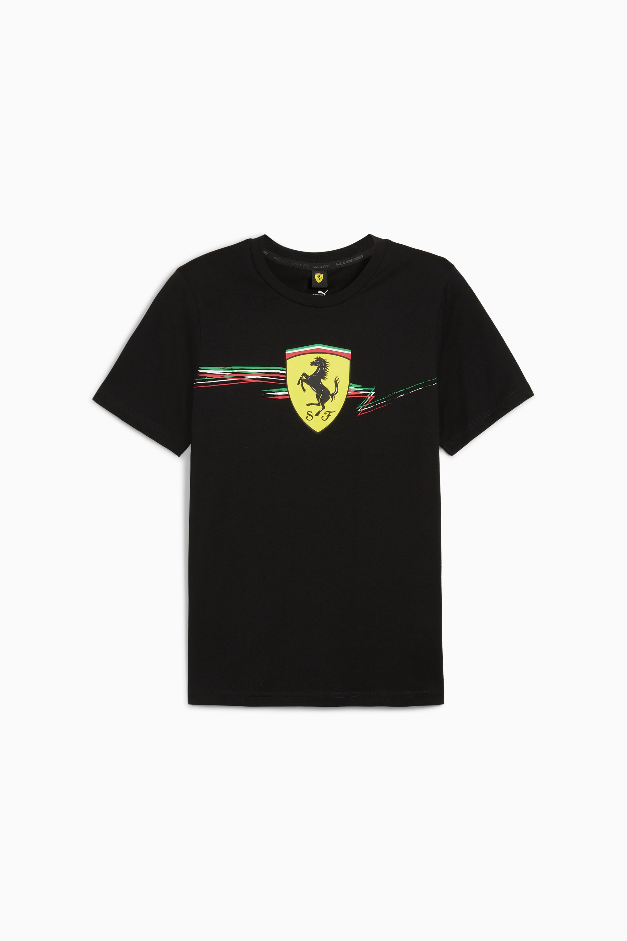 PRODUCT STORY Rev up your style and unleash your inner racing car driver in this bold Scuderia Ferrari tee. Accelerate into action and speed down the straights of daily life with an iconic prancing horse graphic on your chest. FEATURES & BENEFITS - Made with at least 20% recycled cotton DETAILS - Style: 627055_01 - Color: PUMA Black - Regular fit, regular length - 160 gsm, single jersey - Crew neck - Short sleeves - Scuderia Ferrari shield logo with supporting graphic on the chest - PUMA branding details MATERIAL INFORMATION - Shell: 100% cotton - Rib: 75% cotton, 25% polyester