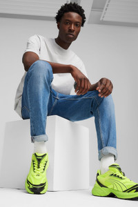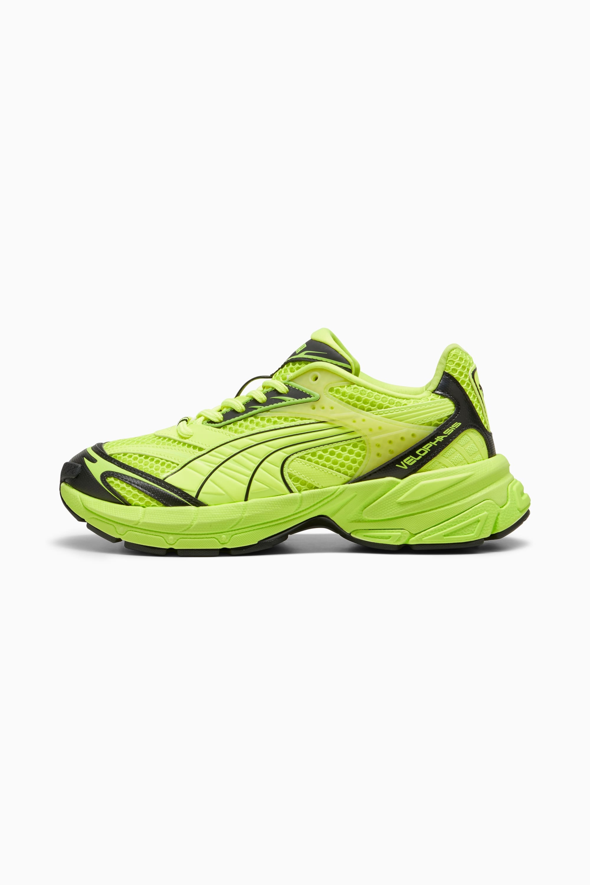 PRODUCT STORY The Velophasis was created by blended references from a similar design aesthetic to create something new and authentic. Its silhouette is a 2000s hybrid loosely inspired by PUMA’s heritage performance running range. This brutal style blends a synthetic and breathable mesh with a bright pattern elemets on the upper. This execution features a breathable mesh upper along with gradient detailed overlays and a translucent molded TPU. FEATURES & BENEFITS - The upper of the shoes is made with at least 20% recycled materials - Vegan certified product DETAILS - Style: 396479_05 - Color: Electric Lime-PUMA Black - Mesh upper with synthetic overlays with gradient effect and embossed details - Mesh tongue with synthetic overlays and textile mesh binding - Textile mesh split lining - Mesh sockliner with screen-printed detail - CMEVA midsole - Rubber outsole MATERIAL INFORMATION - Midsole: 100% Synthetic - Sockliner: 100% Textile - Outsole: 100% Rubber - Upper: 72.81% Synthetic, 27.19% Textile - Lining: 100% Textile
