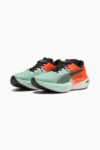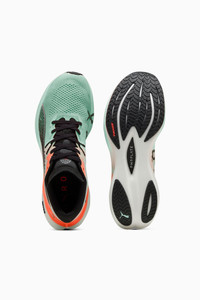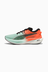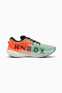 PRODUCT STORY Deviate 3 HYROX is a super-fast, ultra-responsive running shoe for any runner and HYROX racer. It provides best-in-class cushioning for a strong, snappy, and comfortable ride at any pace – with nitrogen-infused NITROFOAM™ for maximum energy return, PWRPLATE technology for responsiveness, and PUMAGRIP for the perfect traction to crush the sled push. This pair features oversized PUMA x HYROX branding so you can rep the sport in style. FEATURES & BENEFITS - NITROFOAM™: Innovative nitrogen-infused foam technology for lightweight responsiveness and cushioning - PWRPLATE: Full-length carbon fiber plate for powerful propulsion and elite efficiency - PUMAGRIP: Outsole is made of durable rubber compound for multi-surface traction - The upper of the shoes is made with at least 20% recycled materials. DETAILS - Style: 312293_01 - Color: Glowing Red-Mint Melt - Fit: Regular - Toe Type: Rounded - Fastener: Laces - Heel type: Flat - Heel-to-toe drop: 10.0mm - Stack height: 39mm/29mm - Recommended for neutral pronators MATERIAL INFORMATION - Midsole: 100% Synthetic - Sockliner: 100% Textile - Outsole: 100% Rubber - Upper: 73% Textile, 27% Synthetic - Lining: 100% Textile