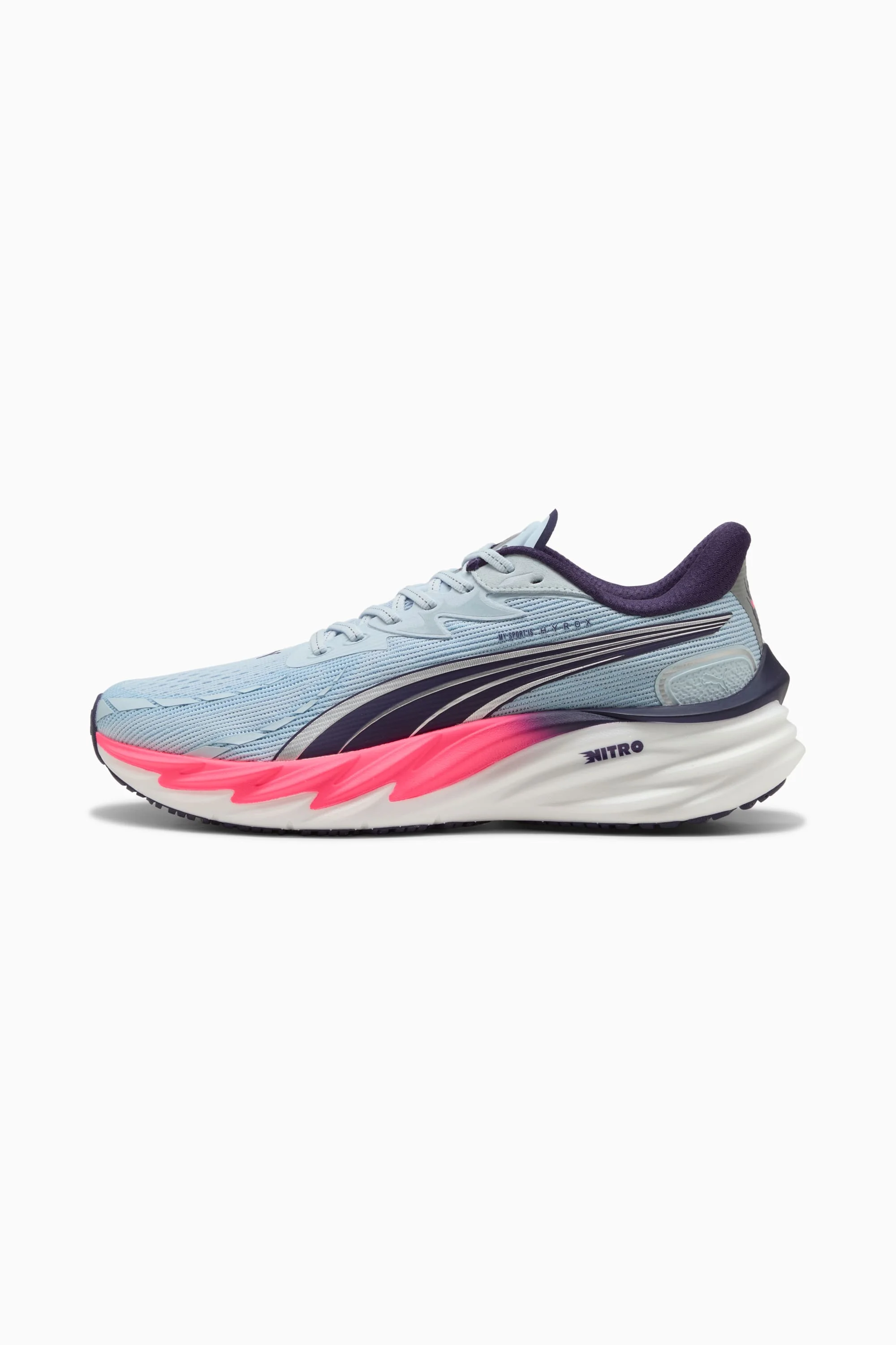 PRODUCT STORY The PUMA x HYROX Velocity NITRO™ 4 running shoe is built to handle the full demands of hybrid fitness racing. Designed for versatility, it delivers a smooth, cushioned ride through runs, reps, and everything in between. From first-time HYROX athletes to seasoned competitors, this shoe brings together comfort, responsiveness, and race-ready durability. FEATURES & BENEFITS - NITROFOAM™: New innovative nitrogen-infused foam technology compound that uses premium raw materials to provide high rebound and a lightweight ride - PUMAGRIP: Durable performance rubber compound designed for all-surface traction - The upper of the shoes is made with at least 30% recycled materials. DETAILS - Style: 312915_01 - Color: Lucite-Pure Pink-Deep Plum - Width: Regular - Toe type: Rounded - Fastener: Laces - Heel type: Flat - Cushioning: Medium - Heel-to-toe drop: 10mm - Pronation: Neutral MATERIAL INFORMATION - Sockliner: 100% Textile - Outsole: 100% Rubber - Upper: 69.33% Textile, 27.81% Synthetic, 2.86% Leather - cow - Lining: 100% Textile