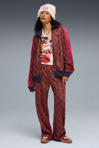 PRODUCT STORY This season's PUMA x KIDSUPER collaboration is where art meets sport. The collection features an eclectic mix of retro athletic silhouettes and modern art graphics. Keep an eye out for vintage goalie jerseys, a puffer jacket with detailed stitching, and jerseys decorated with watercolor prints. FEATURES & BENEFITS - Made with at least 90% recycled materials. DETAILS - Style: 632375_96 - Color: Ruby Shimmer-AOP - Fit: Relaxed - Main Material: Double face jacquard - Length: Regular - Rise: Medium - Pockets: Side Pocket - Elasticated waistband with internal drawcords - PUMA x KIDSUPER co-branding details MATERIAL INFORMATION - Inserts: 59% polyester, 41% cotton - Shell: 100% polyester - Pocket Bag: 100% cotton