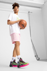 PRODUCT STORY Melo is HEEM. LaMelo Ball’s signature shoe, the MB.04, gets a neon redesign inspired by the energy he brings on the court. The MB.04 HEEM is engulfed in alien tentacles with Melo sayings hidden in the design. Complete with a supportive double-layered mesh upper and NITROFOAM™ cushioning for on-court power, this pair features neon yellow, green, and pink colors and an alien Melo graphic at the heel. FEATURES & BENEFITS - NITRO™: Advanced nitrogen-infused foam designed to provide superior responsiveness and cushioning in a lightweight package - 5D PRINTED UPPER: A raised, multi-layered design takes over the shoe like alien tentacles - MELO DNA: Melo phrases like 1 OF ONE and RARE are hidden throughout the design - UNIQUE HEEL LOGO: The heel includes alien Melo dunking and NOT FROM HERE wording - OUTSOLE DETAILS: The sole features a hovering spaceship, NOT FROM HERE and RARE wording, and flames at the heel DETAILS - Style: 310837_01 - Color: PUMA Black-Luminous Pink-Electric Lime - Regular fit - Woven mesh upper - Lace closure - TPU heel counter - PUMA branding details MATERIAL INFORMATION - Midsole: 100% Synthetic - Sockliner: 100% Textile - Outsole: 100% Rubber - Upper: 59% Synthetic, 41% Textile - Lining: 100% Textile