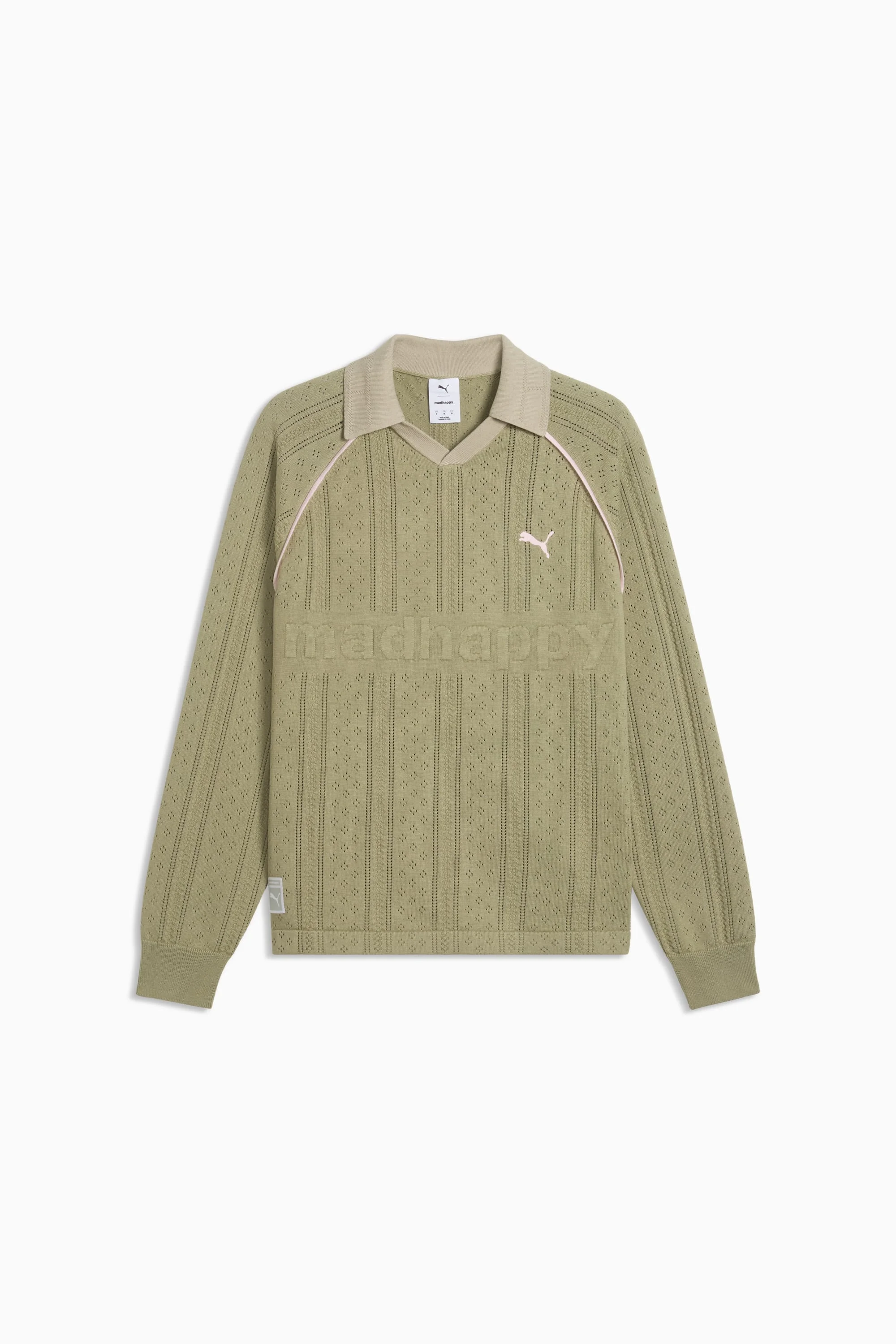 PRODUCT STORY Good vibes only. The PUMA x MADHAPPY collection consists of classic sportswear and feel-good loungewear designed to lift the mood. Elevated details like pointelle and lace add softness and texture to athletic silhouettes. This long sleeve jersey brings that spirit to match-day style, reimagining a classic football jersey in soft and breathable pointelle knit. DETAILS - Style: 637566_82 - Color: Lux Army - Fit: Relaxed - Main material type: Pointelle knit - Neck: Collar - Long sleeves - Length: Regular - Co-branding details MATERIAL INFORMATION - Shell: 60% cotton, 40% polyester - Collar: 53% cotton, 36% polyester, 9% nylon, 2% elastane - Sleeve Cuff: 58% cotton, 40% polyester, 1% nylon, 1% elastane