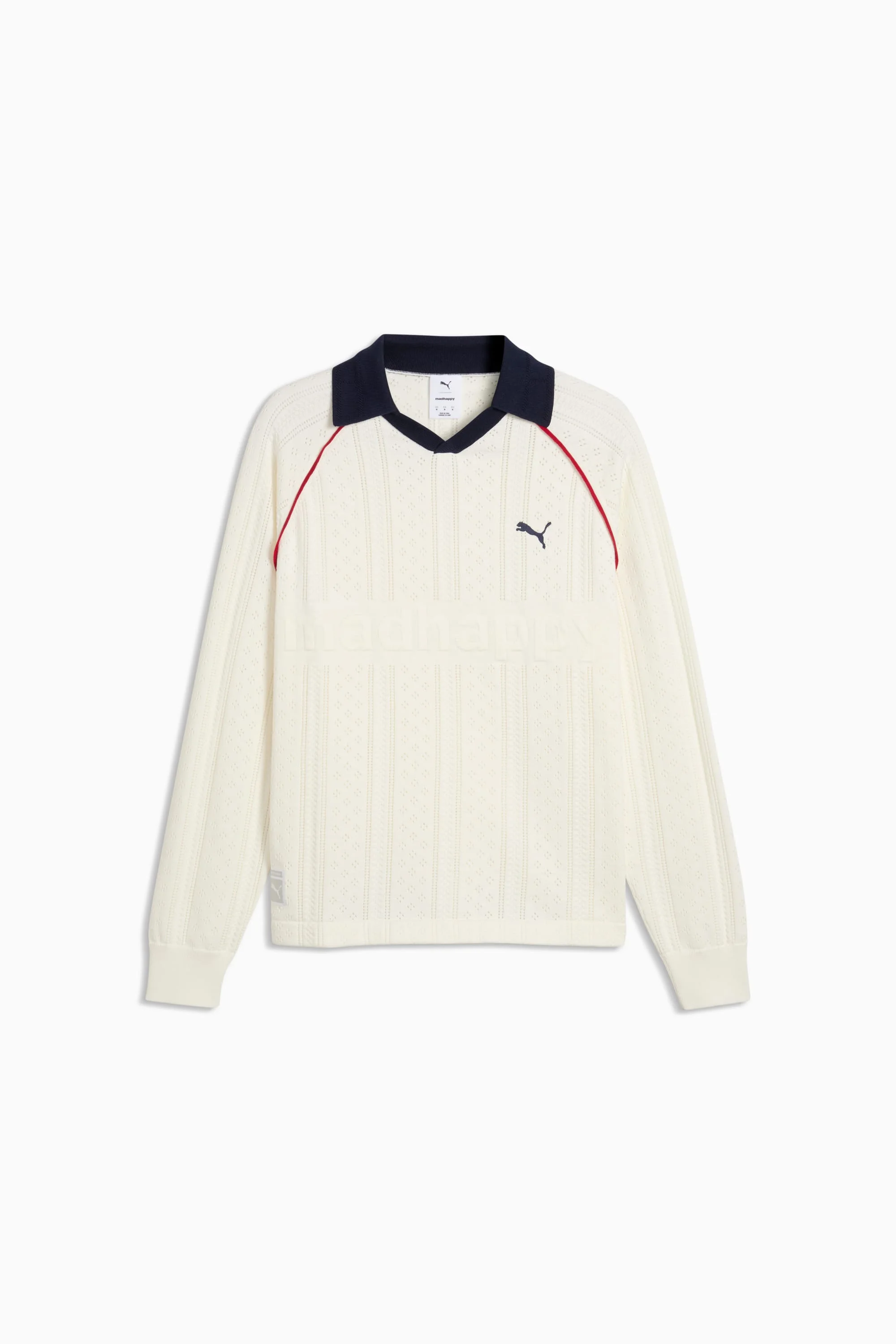 PRODUCT STORY Good vibes only. The PUMA x MADHAPPY collection consists of classic sportswear and feel-good loungewear designed to lift the mood. Elevated details like pointelle and lace add softness and texture to athletic silhouettes. This long sleeve jersey brings that spirit to match-day style, reimagining a classic football jersey in soft and breathable pointelle knit. DETAILS - Style: 637566_57 - Color: Warm White - Fit: Relaxed - Main material type: Pointelle knit - Neck: Collar - Long sleeves - Length: Regular - Co-branding details MATERIAL INFORMATION - Shell: 60% cotton, 40% polyester - Collar: 53% cotton, 36% polyester, 9% nylon, 2% elastane - Sleeve Cuff: 58% cotton, 40% polyester, 1% nylon, 1% elastane