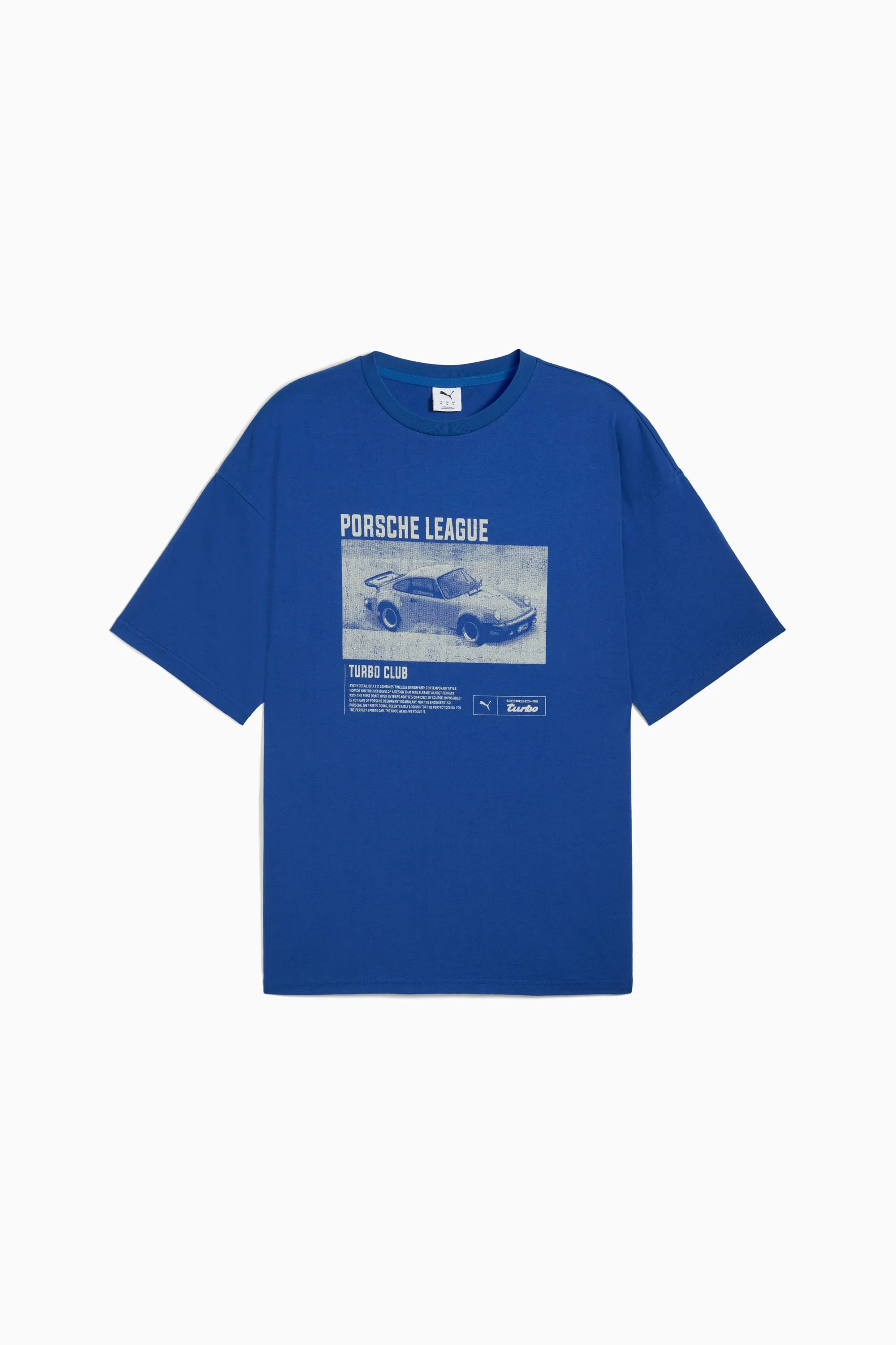 PRODUCT STORY For those who move with effortless confidence, the newest PUMA x PORSCHE LEGACY drop merges vintage sport aesthetics with a modern streetwear edge. Relaxed silhouettes, sun-faded neutrals, and worn-in textures create a laid-back, well-loved feel. Graphic tees, oversized outerwear, and washed leather offer a rugged yet refined look, perfect for effortless summer days and nights that never stop. FEATURES & BENEFITS - Made with at least 20% recycled cotton. DETAILS - Style: 632691_14 - Color: Clyde Royal - Oversized fit - Main material type: Single jersey - Short sleeves - Crew neck - Regular length - Porsche League Turbo Club graphic on the front MATERIAL INFORMATION - Shell: 100% cotton - Rib: 71% cotton, 29% polyester