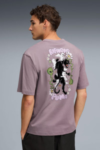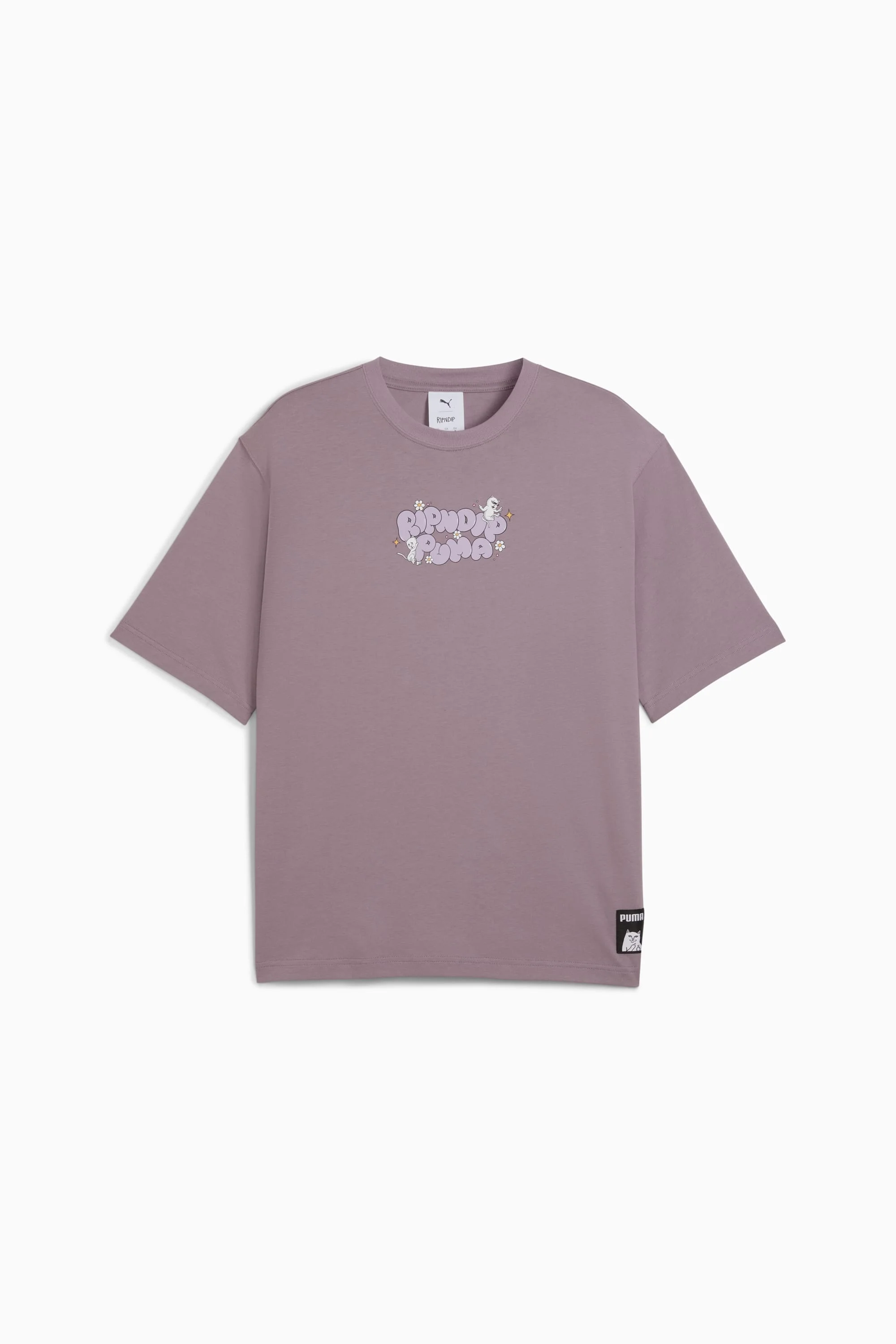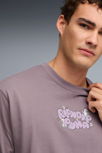 PRODUCT STORY Nermal is back for more. Did you miss him? PUMA is partnering with Los Angeles based streetwear and lifestyle brand RIPNDIP for an out-of-the-box collection of footwear, apparel, and accessories. This collection features a mix of classic streetwear essentials and pieces centered around mind-bending graphics. FEATURES & BENEFITS - Made with at least 20% recycled cotton DETAILS - Style: 632413_64 - Color: Plum Jam - Boxy fit - Crew neck - Short sleeves - Graphic print details - PUMA x RIPNDIP co-branding details MATERIAL INFORMATION - Shell: 100% cotton - Rib: 70% cotton, 30% polyester