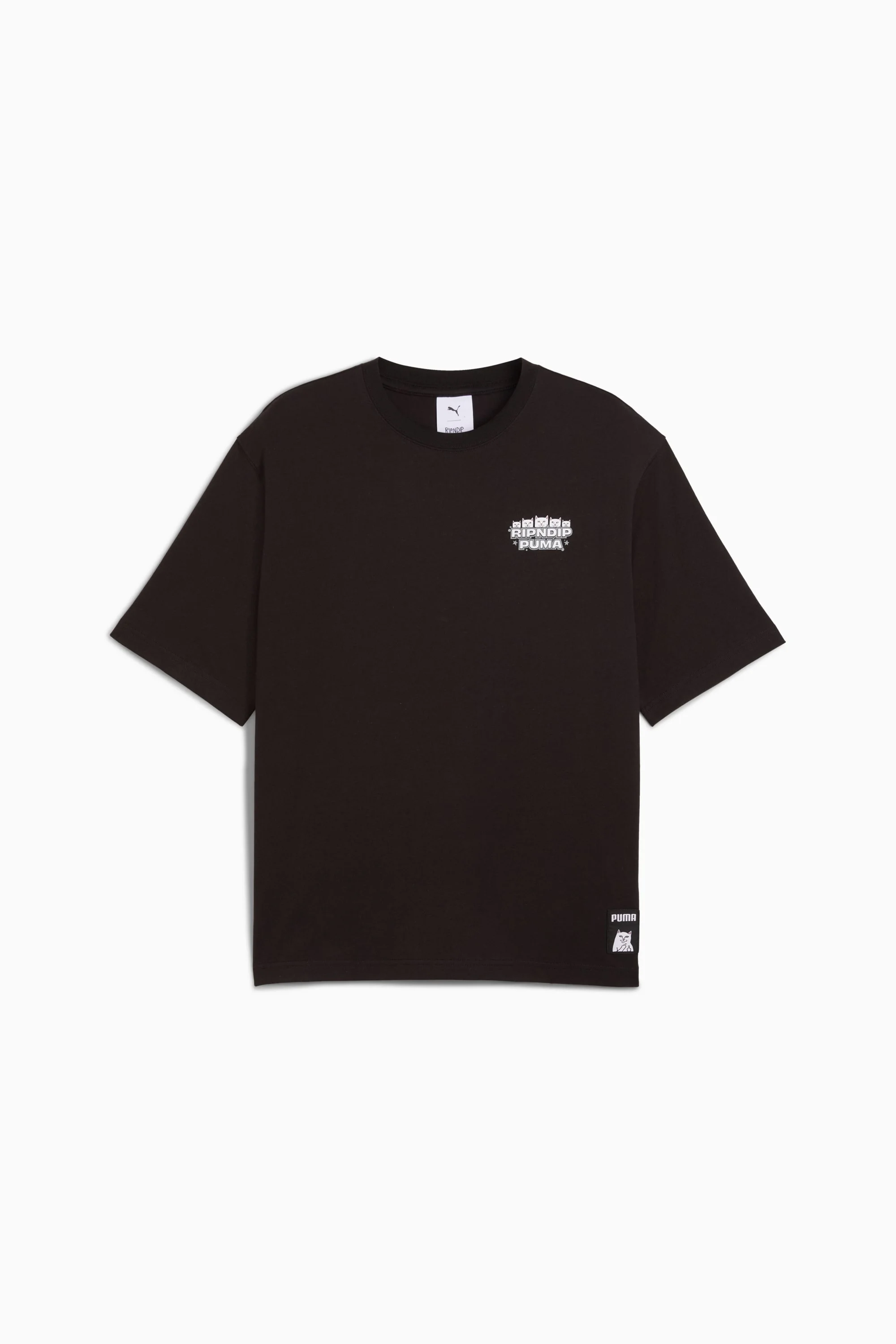 PRODUCT STORY Nermal is back for more. Did you miss him? PUMA is partnering with Los Angeles based streetwear and lifestyle brand RIPNDIP for an out-of-the-box collection of footwear, apparel, and accessories. This collection features a mix of classic streetwear essentials and pieces centered around mind-bending graphics. FEATURES & BENEFITS - Made with at least 20% recycled cotton DETAILS - Style: 632413_01 - Color: PUMA Black - Boxy fit - Crew neck - Short sleeves - Graphic print details - PUMA x RIPNDIP co-branding details MATERIAL INFORMATION - Shell: 100% cotton - Rib: 70% cotton, 30% polyester