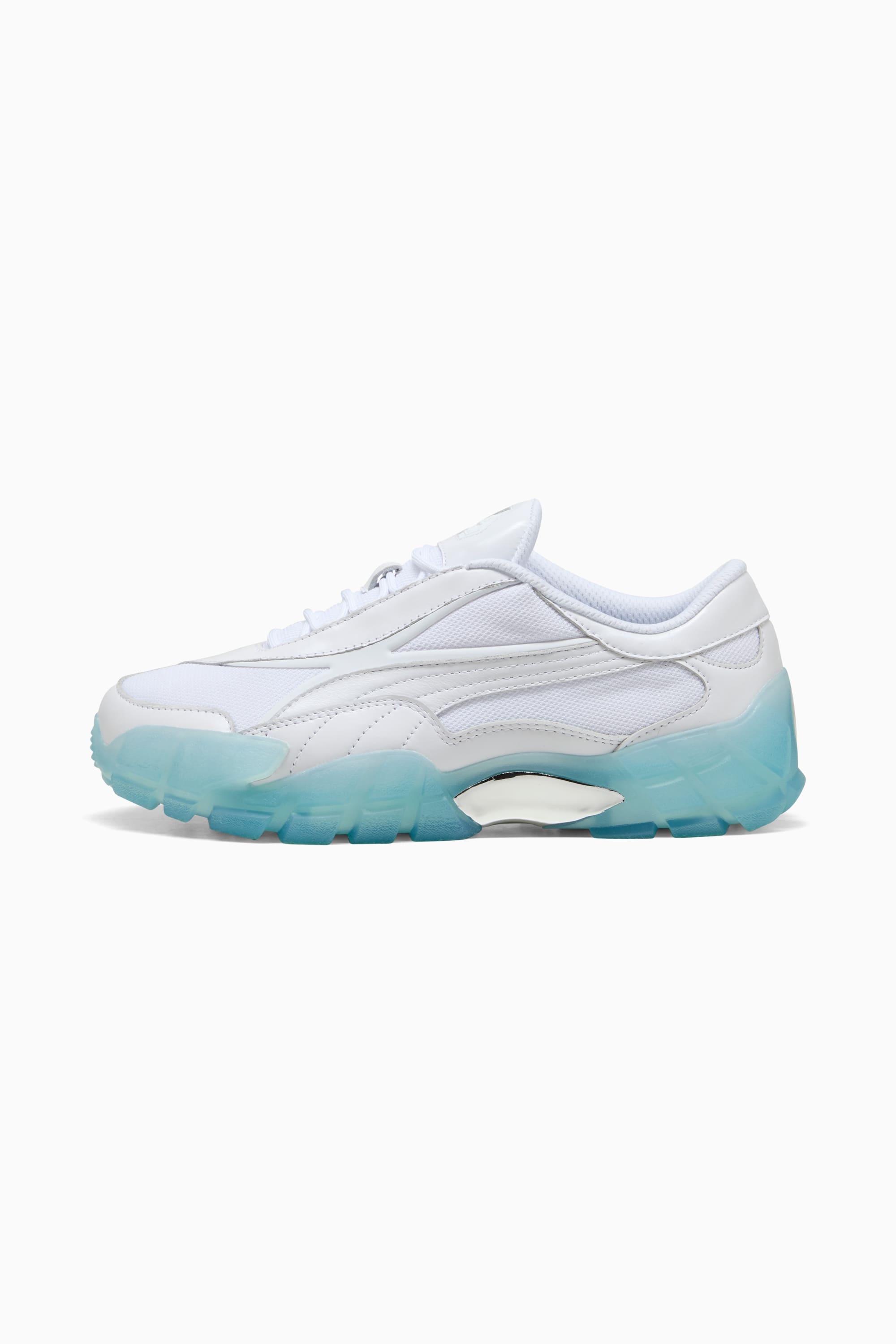 PRODUCT STORY PUMA x SKEPTA goes ice white. This flooded white collection is inspired by Skepta’s iconic aesthetic. Two re-designed Skopes with iced out soles are paired with a suite of elevated streetwear essentials: a jacket and short tracksuit, a vest and a cap. Skepta’s signature style meets PUMA’s design precision and streetwear edge. DETAILS - Style: 404444_02 - Color: PUMA White-Regal Blue - Heel type: Flat - Closure: Lace closure - Upper: Leather and mesh - Sole: Chunky semi transparent rubber sole - Insert: Chrome - Logo patch at tongue - PUMA branding details MATERIAL INFORMATION - Sockliner: 100% Textile - Outsole: 100% Rubber - Upper: 53.40% Leather - cow, 38.97% Textile, 7.63% Synthetic - Lining: 100% Textile