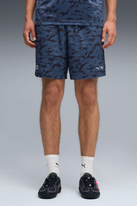 PRODUCT STORY Welcome back to the game, players. PUMA x SQUID GAME returns with a fresh drop inspired by season 3 of the global hit series. The new collection takes the PUMA x SQUID GAME aesthetic to the next level, featuring designs inspired by the show's theme of what happens when the lights go out. Bold, dynamic allover prints and glow-in-the-dark accents define these pieces, with hidden details inspired by Jump Rope, Hide and Seek, and the final Squid Game. DETAILS - Style: 630758_16 - Color: New Navy - Fit: Relaxed - Plain weave material - Length: Above-knee length - Rise: Medium - All-over print - Elasticated waistband with drawcords - Pockets: Back pocket - PUMA x SQUID GAME co-branded print details - Glow-in-the-dark design details