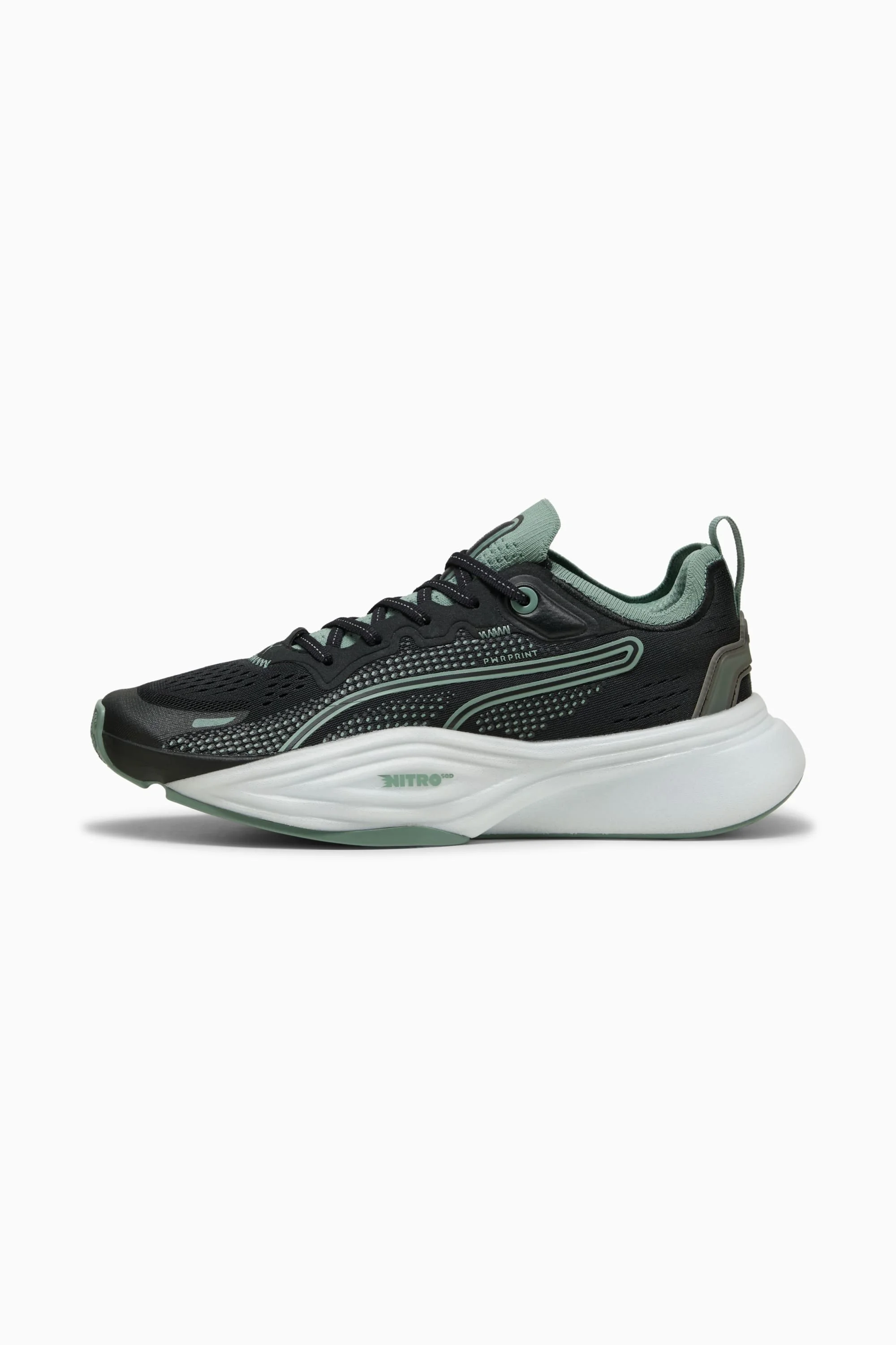 PRODUCT STORY Train hard and push your limits in the PWR NITRO™ SQD 2. NITRO™ SQD technology gives explosive energy and all-around support. PUMAGRIP traction grips any surface. Unlock peak performance and smash through plateaus. These training shoes unleash your power. FEATURES & BENEFITS - The upper of the shoes is made with at least 20% recycled materials - NITRO™ SQD: Innovative dual density NITRO™ SQD midsole combines best in-class cushioning and rebound with all around support – ideal for quick first step and explosive take-off - PUMAGRIP: Durable performance rubber compound designed for all-surface traction DETAILS - Style: 310150_08 - Color: PUMA Black-Green Moon - Regular fit - Engineered mesh upper - Heel support system - Lace closure - PUMA branding details MATERIAL INFORMATION - Midsole: 100% Synthetic - Sockliner: 100% Textile - Outsole: 100% Rubber - Upper: 61% Textile, 39% Synthetic - Lining: 100% Textile