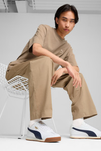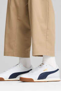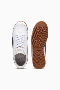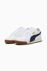 PRODUCT STORY We're bringing back an icon. Born in 1968, the PUMA Roma was originally created to celebrate the Italian Euro Cup win – and become a sport-turned-street sensation overnight. Today, over 50 years later, the Roma is back with its signature sleek look, premium leather, and gum rubber sole. This version features a synthetic upper and a leather Formstrip with stitching details. FEATURES & BENEFITS - PUMA's leather products support responsible manufacturing via the Leather Working Group: www.leatherworkinggroup.com - ProFoam: Lightweight EVA designed to cushion your landing and propel your next step DETAILS - Style: 398634_04 - Color: PUMA White-Club Navy-Gum - Regular fit - Synthetic upper - Synthetic toe, eyestay, and heel overlays - Synthetic lining - Lace closure - EVA midsole - Leather PUMA Formstrip with stitching details - PUMA branding details MATERIAL INFORMATION - Sockliner: 100% Textile - Outsole: 100% Rubber - Upper: 77.36% Leather - cow, 22.64% Synthetic - Lining: 61.29% Textile, 38.71% Synthetic