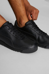 PRODUCT STORY Step up your sneaker game with the PUMA Roma Basic sneakers. With a classic silhouette and iconic PUMA branding, these sneakers are a must-have for any sneaker enthusiast. The cushioned midsole provides all-day comfort, while the durable rubber outsole offers traction and stability. Whether you're hitting the streets or heading to the gym, the PUMA Roma Basic sneakers will keep you stylish and comfortable every step of the way. Elevate your sneaker collection with these timeless kicks from PUMA. DETAILS - Style: 353572_17 - Color: black-black - Classic Roma silhouette - Synthetic leather upper - Full lace closure - Padded tongue and collar - EVA midsole for lightweight cushioning - Rubber outsole with special tread pattern - Contrast PUMA Formstrip overlay at side - PUMA Roma callout at lateral side - PUMA Archive label at tongue MATERIAL INFORMATION - Sockliner: 100% Textile - Outsole: 100% Rubber - Upper: 97.63% Synthetic, 2.37% Textile - Lining: 100% Textile