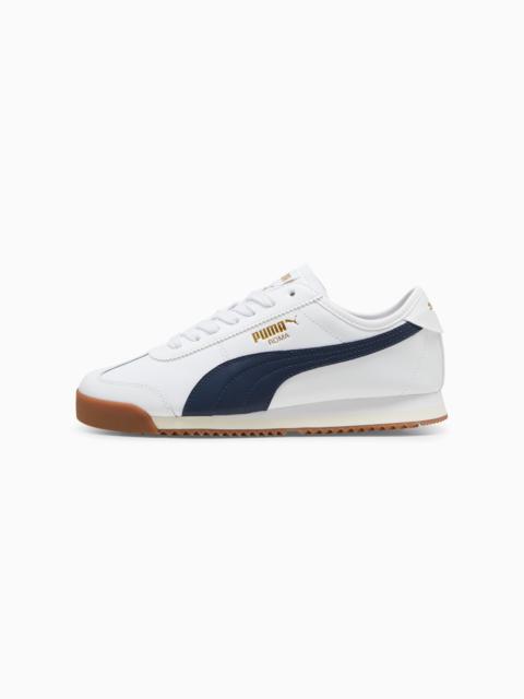 PRODUCT STORY We're bringing back an icon. Born in 1968, the PUMA Roma was originally created to celebrate the Italian Euro Cup win – and become a sport-turned-street sensation overnight. Today, over 50 years later, the Roma is back with its signature sleek look and gum rubber sole. This version features a suede upper with suede overlays, a thick padded tongue, and orthopaedic arch supports. FEATURES & BENEFITS - PUMA's leather products support responsible manufacturing via the Leather Working Group: www.leatherworkinggroup.com - ProFoam: Lightweight EVA designed to cushion your landing and propel your next step DETAILS - Style: 398635_08 - Color: Port-Warm White-Gum - Regular fit - Suede upper - Suede and synthetic overlays - Mesh lining - Lace closure - EVA midsole - Suede PUMA Formstrip with tumbled finish - PUMA branding details