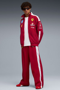 PRODUCT STORY Two legends, twenty years of burning rubber. Celebrate the twentieth anniversary of PUMA for SCUDERIA FERRARI HP with the 2025 Replica Collection. This oversized jacket, featuring PUMA's signature T7 stripes, captures the elegance and performance of Scuderia Ferrari. Featuring the iconic shield logo, elasticated hems, and zipped side pockets, it's designed for those who live for speed. Join the team with PUMA and feel the thrill. Tifosi, welcome to the crew. FEATURES & BENEFITS - Made with at least 30% recycled materials. DETAILS - Style: 713572_01 - Color: Dark Cherry - Oversized fit - Plain weave - Standard jacket length - Collar - Full zip closure - Long sleeves - Zipped pockets - Scuderia Ferrari and PUMA branding details MATERIAL INFORMATION - Inserts: 100% polyester - Lining: 100% polyester - Shell: 100% nylon