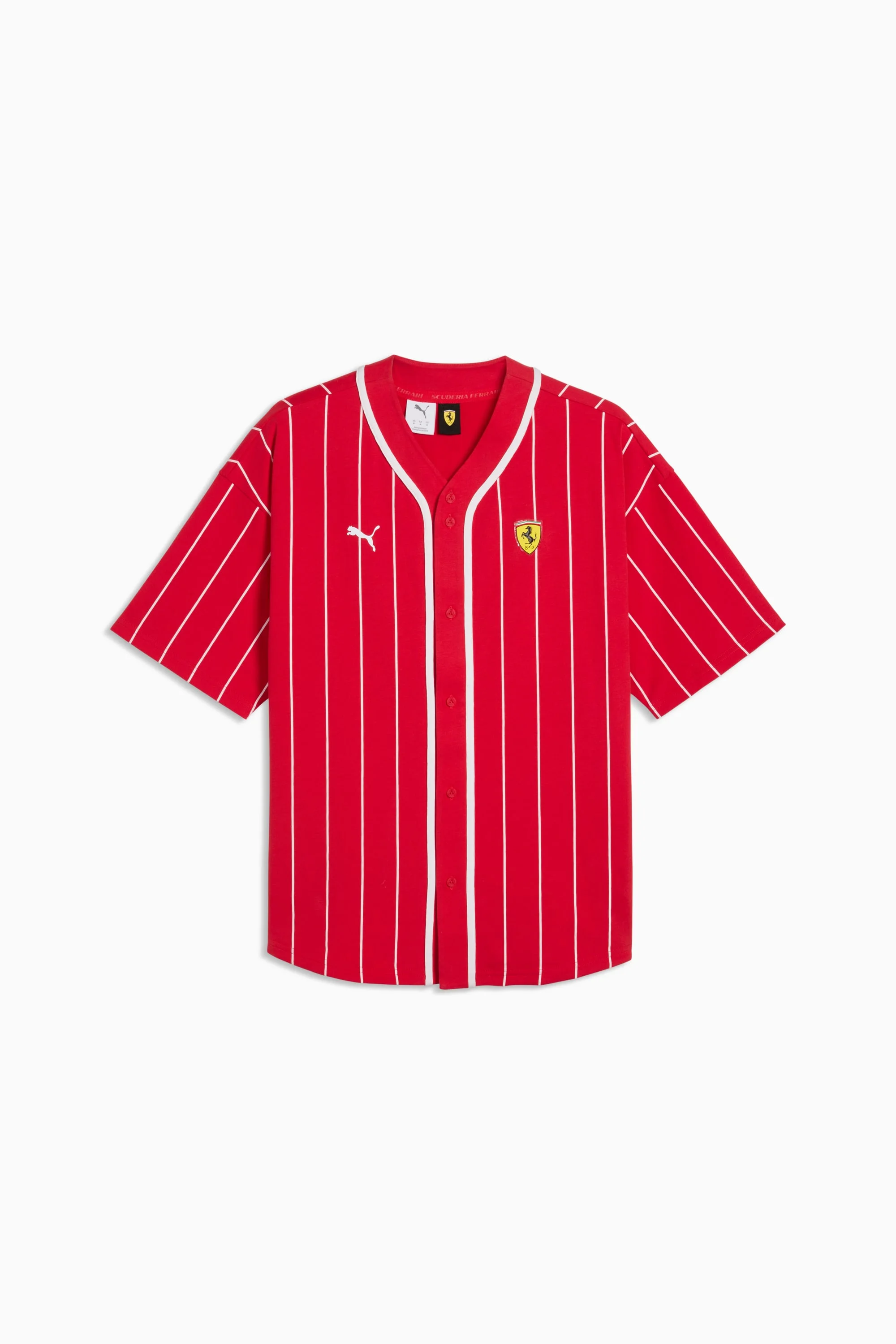 PRODUCT STORY The PUMA and Scuderia Ferrari collection is a tribute to motorsport excellence and Ferrari's legendary racing heritage. This range of shoes, clothes, and accessories combines style, comfort, and performance with the iconic Scuderia Ferrari colours and details, so you can embrace the Ferrari legacy wherever you go. This baseball jersey is ready for wherever the adrenaline takes you. FEATURES & BENEFITS - Made with at least 20% recycled cotton. DETAILS - Style: 635866_01 - Color: Rosso Corsa - Fit: Relaxed - Main material type: Single jersey - Neck: Crew neck - Short sleeves - Closure: Button placket - Length: Regular MATERIAL INFORMATION - Inserts: 100% cotton - Shell: 100% cotton
