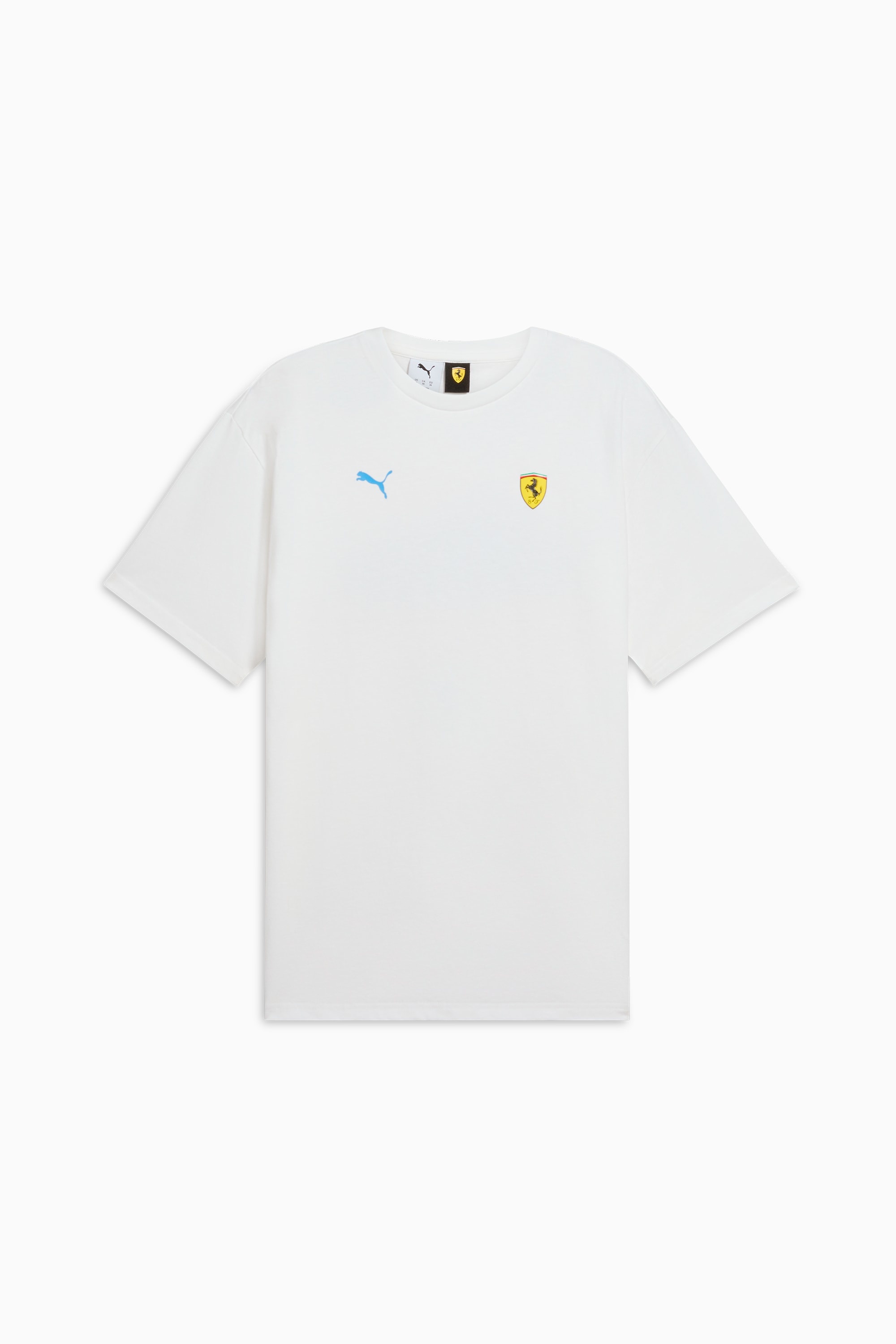 PRODUCT STORY Borrowing from the world of away kits, PUMA for SCUDERIA FERRARI HP is back with a limited-edition drop in an alternative white colorway – pulled from the accent color of the 2025 car livery. Featuring replica tees and caps worn by Lewis Hamilton and Charles Leclerc, it’s made for fans who never leave the Prancing Horse at home. DETAILS - Style: 633411_03 - Color: PUMA White - Relaxed fit - Regular length - Crew neck - Short sleeves - Miami graphic detail on the back - Scuderia Ferrari and PUMA Cat logo on the chest MATERIAL INFORMATION - Shell: 100% cotton - Rib: 71% cotton, 29% polyester