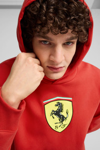 PRODUCT STORY Accelerate your style in this bold Scuderia Ferrari hoodie. The brushed fleece lining keeps you warm as the Scuderia Ferrari shield boldly proclaims your passion for speed. Conquer cold weather and show your love for the prancing horse. FEATURES & BENEFITS - Made with at least 20% recycled cotton DETAILS - Style: 627054_02 - Color: Rosso Corsa - Regular fit, regular length - 280 gsm, fleece - Brushed fleece lining - Hood - Long sleeves - Kangaroo pocket - Large Scuderia Ferrari shield embroidery on the chest - PUMA cat on the right sleeve MATERIAL INFORMATION - HOOD LINING: 100% cotton - SHELL: 68% cotton, 32% polyester - RIB: 97% cotton, 3% elastane