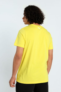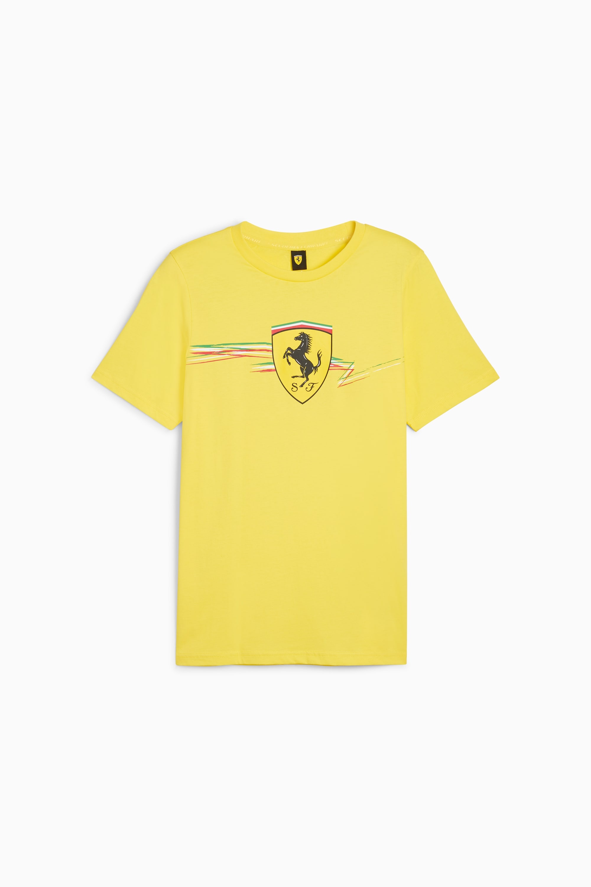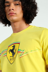 PRODUCT STORY Rev up your style and unleash your inner racing car driver in this bold Scuderia Ferrari tee. Accelerate into action and speed down the straights of daily life with an iconic prancing horse graphic on your chest. FEATURES & BENEFITS - Made with at least 20% recycled cotton DETAILS - Style: 627055_03 - Color: Speed Yellow - Regular fit, regular length - 160 gsm, single jersey - Crew neck - Short sleeves - Scuderia Ferrari shield logo with supporting graphic on the chest - PUMA branding details MATERIAL INFORMATION - Shell: 100% cotton - Rib: 75% cotton, 25% polyester