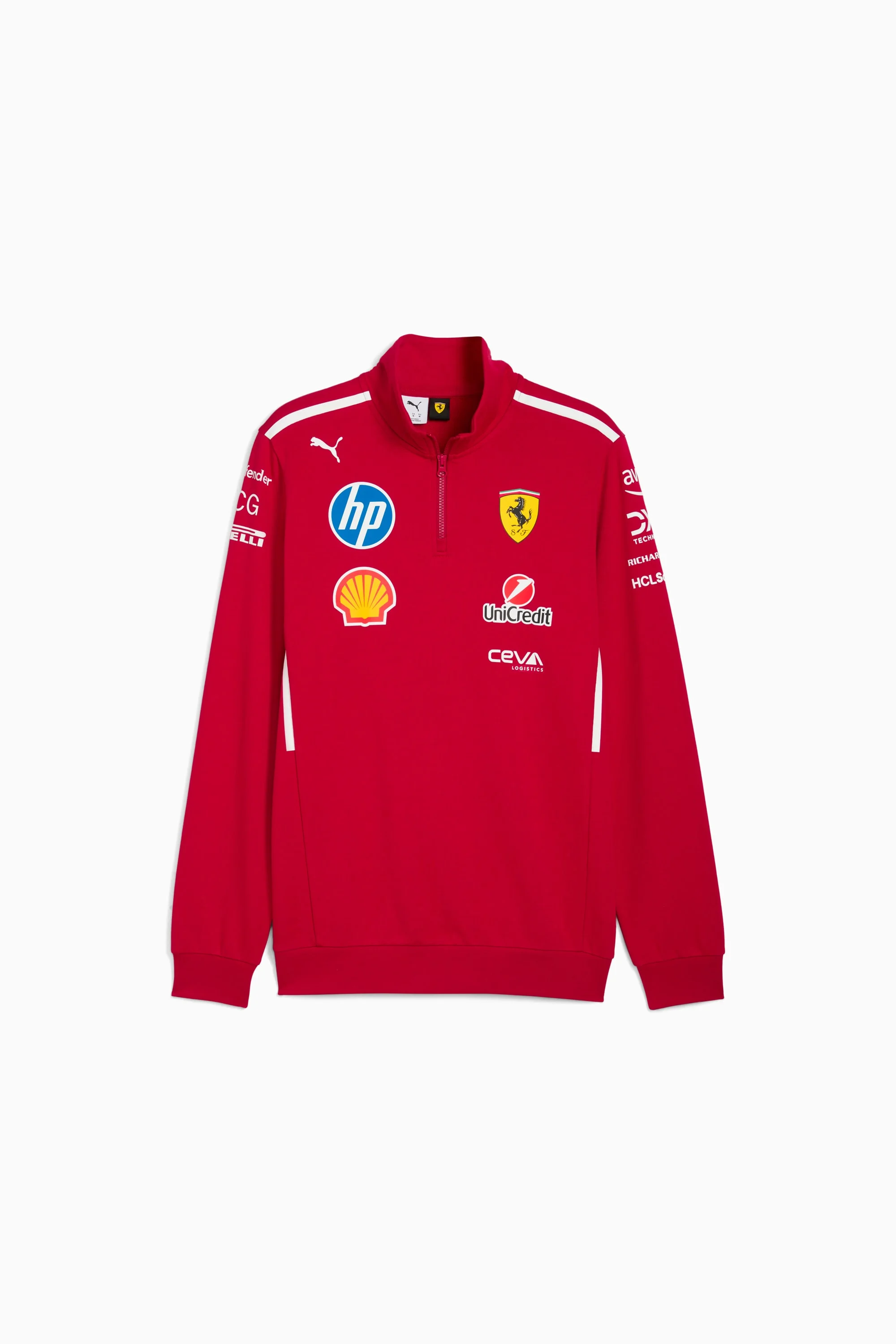 PRODUCT STORY Introducing the new team racing color for the 2025 season, this PUMA piece seamlessly combines performance and style. With a crew neck and heat-transfer sponsor logos, it's part of the latest Scuderia Ferrari HP collection worn by the team at the track. Show your support for the Italian team with this sleek and dynamic design. DETAILS - Style: 763942_01 - Color: Dark Cherry - Regular fit - French Terry material - Regular length - Collar - Quarter-zip - Long sleeves - Heat transfer sponsor logo application - PUMA and Scuderia Ferrari branding details MATERIAL INFORMATION - Shell: 100% cotton - Rib: 97% cotton, 3% elastane