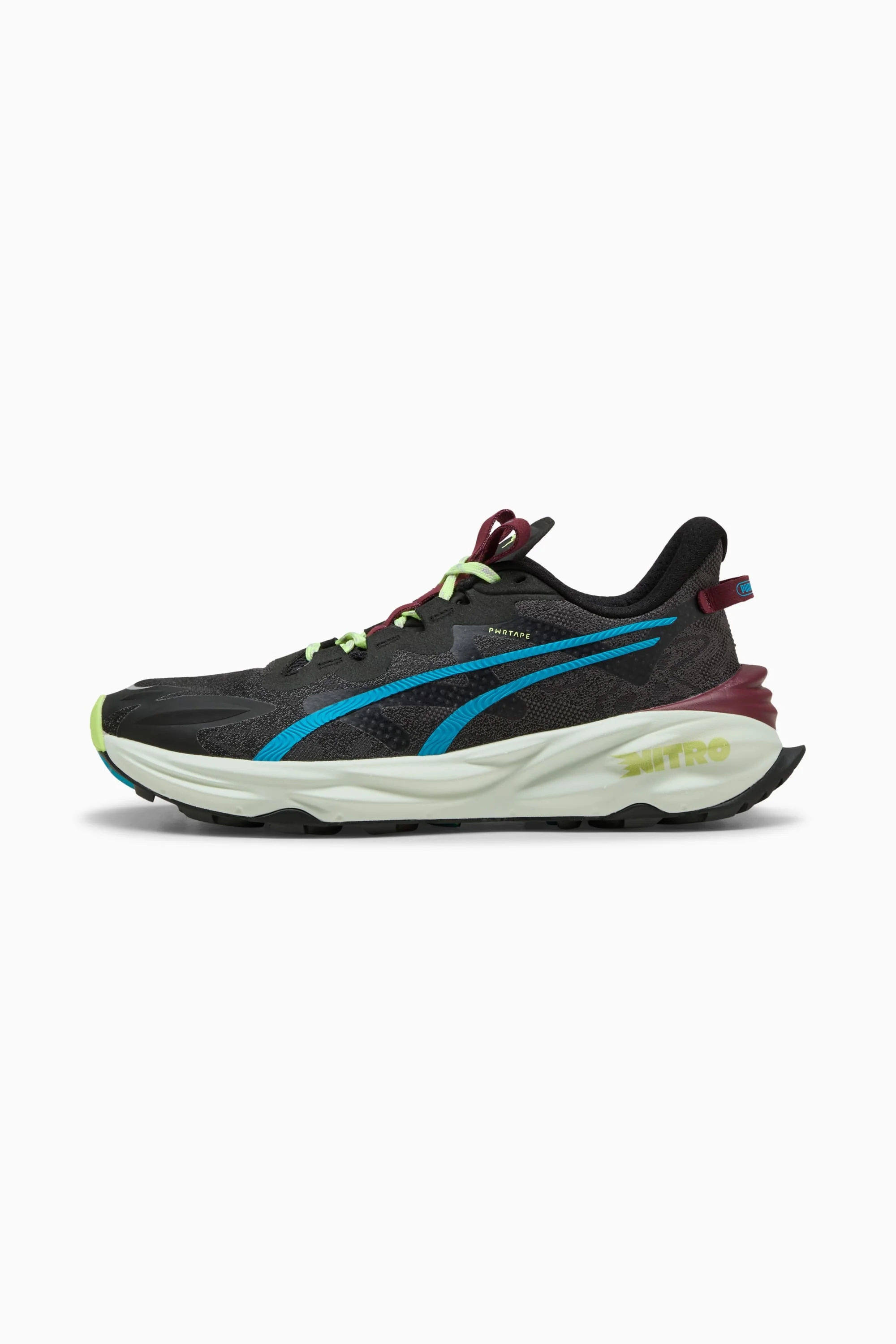 PRODUCT STORY Introducing the PUMA Fast-Trac 3, the ultimate low-profile trail running companion. Featuring a full-length NITROFOAM™ midsole for responsive cushioning, 4mm PUMAGRIP ATR lugs for unbeatable traction, and a comfortable rolled collar upper, this shoe will elevate your trail running experience. Conquer any terrain with confidence in the PUMA Fast-Trac NITRO™ 3. FEATURES & BENEFITS - The upper of the shoes is made with at least 30% recycled materials - NITROFOAM™: Advanced nitrogen-infused foam designed to provide superior responsiveness and cushioning in a lightweight package - PUMAGRIP ATR: Trail-ready performance rubber compound designed for traction on ice, mud, and unstable surfaces - PWRTAPE: Targeted upper reinforcement for support and durability DETAILS - Style: 379786_19 - Color: PUMA Black-Sage Frost-Ruby Shimmer - Regular fit - Engineered mesh upper - Updated running last - Heel-to-toe drop: 8mm - Recommended for: neutral pronators - Lifespan: 800km MATERIAL INFORMATION - Sockliner: 100% Synthetic - Outsole: 100% Rubber - Upper: 73.57% Textile, 26.43% Synthetic - Lining: 100% Textile