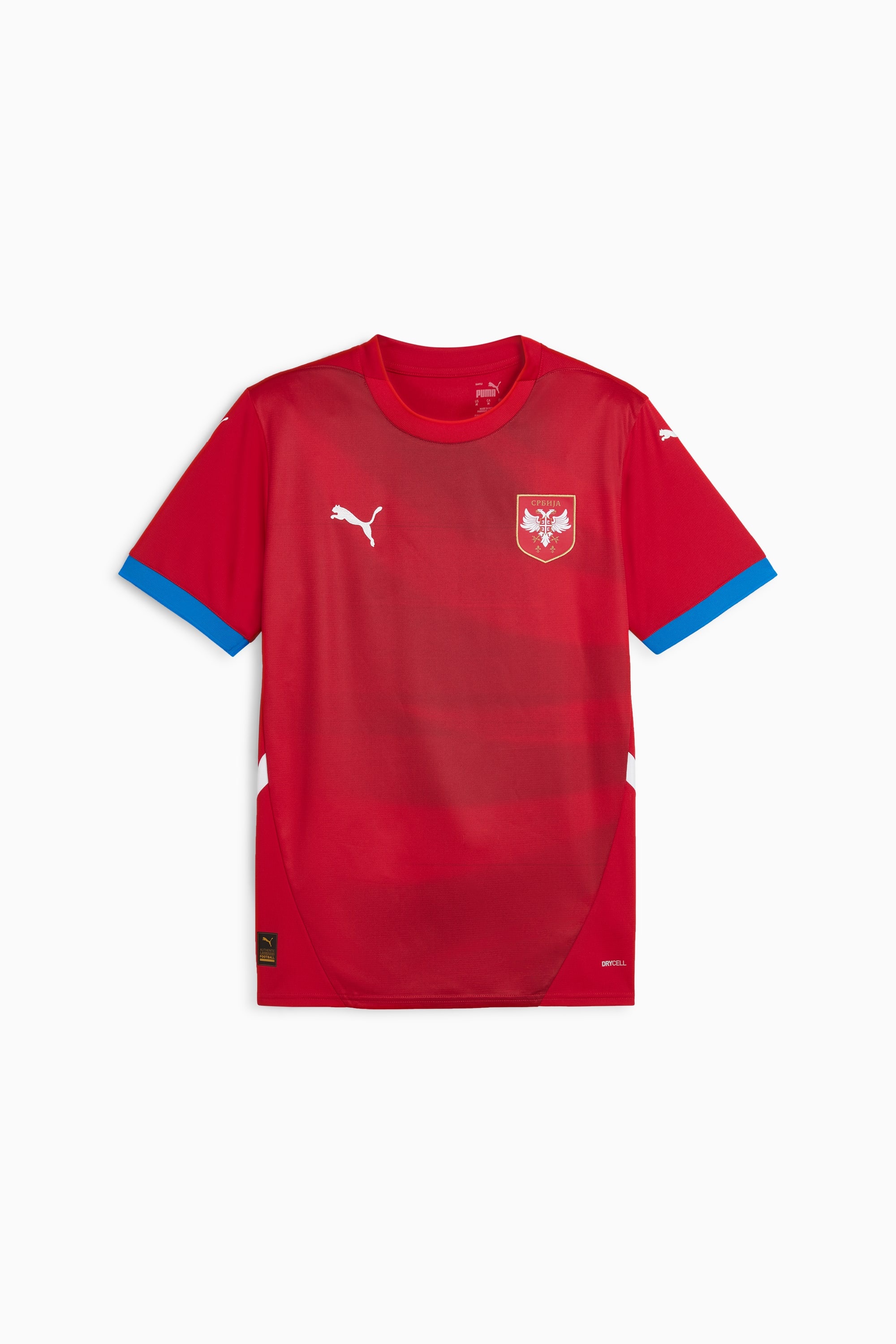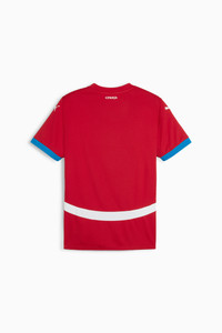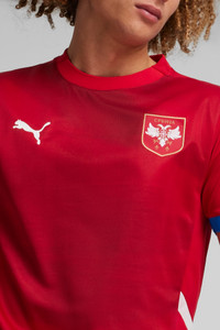 PRODUCT STORY The Serbia 2024 Home Jersey celebrates the pride, precision, and passion of Serbian soccer. This jersey embodies the spirit of the national team, providing fans the look and feel of the team on the pitch that way you can support the Eagles to a proud victory. FEATURES & BENEFITS - As part of the RE:FIBRE program, this garment is made of at least 95% recycled material from textile waste and other used materials. DETAILS - Style: 774300_01 - Color: Dark Cherry-PUMA Team Royal - Regular Fit - 170 gsm, double face jacquard knit fabric - Crew neck - Short sleeves - Official team logo on chest MATERIAL INFORMATION - SHELL: 100% polyester - RIB: 100% polyester