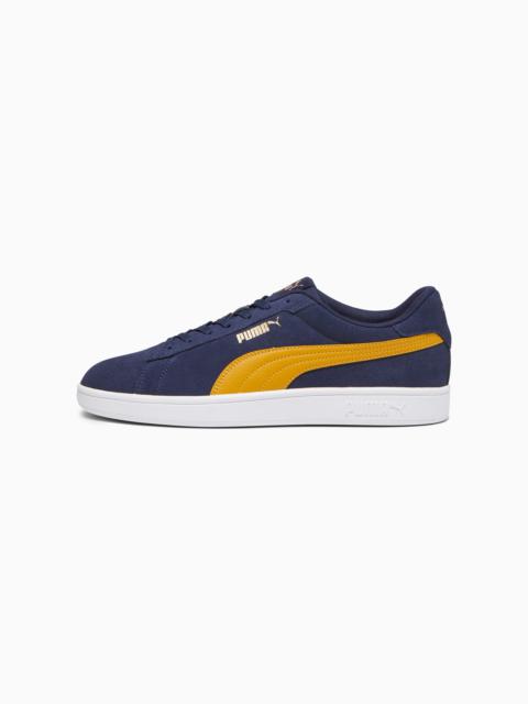 PRODUCT STORY The tennis-inspired Smash is back and better than ever, featuring its classic silhouette, with long, clean lines, and an updated padded collar and sockliner. FEATURES & BENEFITS - LWG: The leather sourced in this product comes from environmentally responsible leather manufacturing and is audited and certified via the Leather Working Group protocol - SOFTFOAM+: Step-in comfort sockliner designed to provide soft cushioning thanks to its extra thick heel DETAILS - Style: 390984_08 - Color: Gray Tile-PUMA Black-PUMA White - Suede upper - Updated eyestay design - Stitched-through and padded collar - Lace closure for a snug fit - PUMA No. 1 Logo on tongue - PUMA No. 2 Logo on quarter - PUMA Formstrip on medial and lateral sides - PUMA Cat Logo on heel MATERIAL INFORMATION - Sockliner: 100% Textile - Outsole: 100% Rubber - Upper: 78.63% Leather - cow, 18.58% Synthetic, 2.79% Textile - Lining: 100% Textile