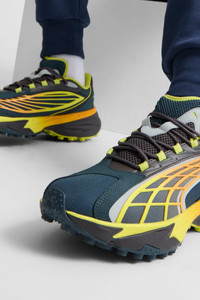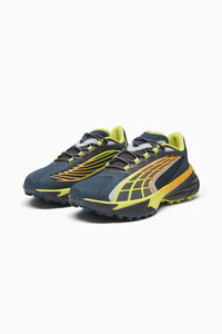 PRODUCT STORY Inspired by PUMA's Icons of Speed, the Spriex Horizon is made for those with bold streetwear style. This running sneaker fuses the past with the future for a unique DNA. Its outsole take its cues from runners' spikes, while this sneaker's upper is a reinterpretation of PUMA's soccer and motorsport styles. A unique colorway gives the Spirex Horizon its signature look which is sure to turn heads. Go ahead, chase the horizon. DETAILS - Style: 397750_01 - Color: Dark Night-Ginger Tea-Olive Oil - Textile base - Formstrip with gradient print - IMEVA midsole with gradient topline - Air mesh tongue - Smooth nubuck toe and heel overlays - Low boot - Lace closure - PUMA branding details MATERIAL INFORMATION - Midsole: 100% Synthetic - Sockliner: 100% Textile - Outsole: 100% Rubber - Upper: 40% Textile, 32% Synthetic, 28% Leather - cow - Lining: 100% Textile