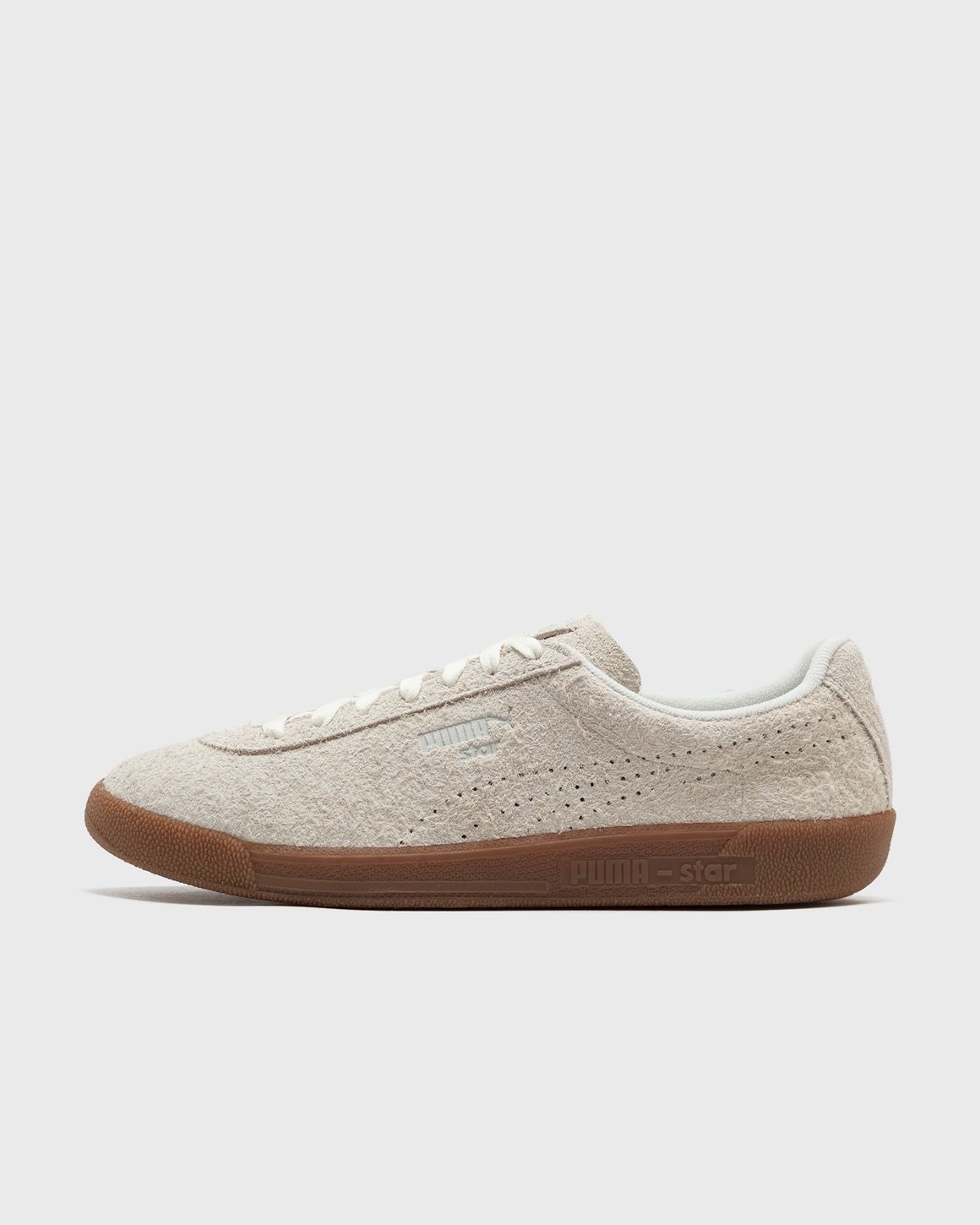 A reimagining of an early 80s tennis classic, the Puma Star comes with a hairy suede upper complemented by a perforated Formstrip. Puma branding on the tongue, side and heel completes the design. - Suede upper - Perforated Formstrip - Textile lining - Molded insole - Rubber midsole - Rubber outsole Article Number: 396465-01 Gender: Men Color: FROSTED IVORY-GUM Material: 30% Rubber, 70% Leather