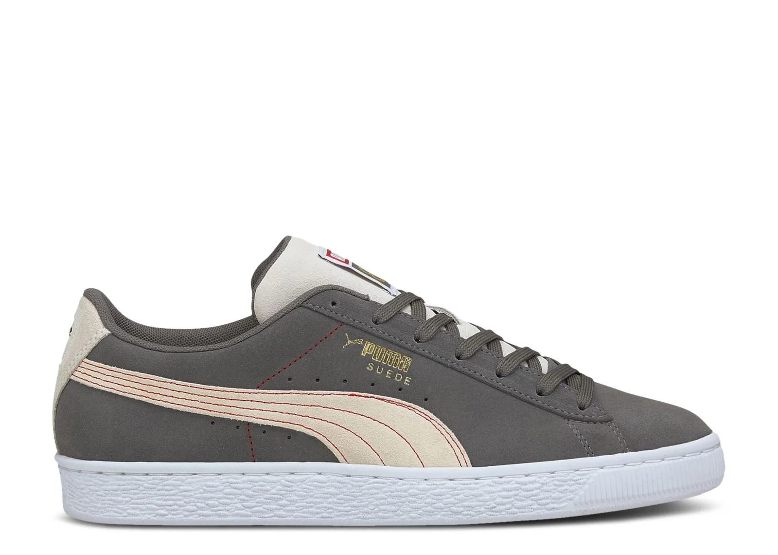 Paying tribute to the silhouette's continuing run, the Suede 'Decades' includes a metallic gold '68' on the woven tongue tag, paying tribute to its debut year. Otherwise built with suede, the shoe's upper appears in grey, with further gold detailing below the eyestay. More suede emerges on the Formstrip, which is accented by red stitching, while underfoot, a contrasting white rubber cupsole supports the fit. SKU: 375906 01 Colorway: Castlerock/Eggnog/White Release Date: 2/2/21