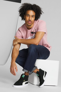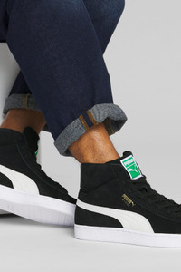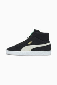 This season, we launch the iconic PUMA Suede into the 21st century in this new mid-top silhouette. The classic style from the '60s hits new heights with a mid-top padded collar and signature suede upper. FEATURES & BENEFITS - BETTER MATERIALS: The leather sourced in this product comes from environmentally responsible leather manufacturing, and is audited and certified via the Leather Working Group protocol DETAILS - Style: 380205_01 - Color: Puma Black-Puma White-Amazon Green - Mid-top silhouette - Full suede upper - Lace closure for snug fit - Rubber sole for durable grip and traction - PUMA Formstrip overlay at side - Gold metallic PUMA Suede callout at lateral side - Woven PUMA label at tongue MATERIAL INFORMATION - Sockliner: 100% Textile - Outsole: 100% Rubber - Upper: 100% Leather - Lining: 100% Textile