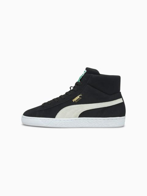 This season, we launch the iconic PUMA Suede into the 21st century in this new mid-top silhouette. The classic style from the '60s hits new heights with a mid-top padded collar and signature suede upper. FEATURES & BENEFITS - BETTER MATERIALS: The leather sourced in this product comes from environmentally responsible leather manufacturing, and is audited and certified via the Leather Working Group protocol DETAILS - Style: 380205_03 - Color: High Risk Red-Puma White - Mid-top silhouette - Full suede upper - Lace closure for snug fit - Rubber sole for durable grip and traction - PUMA Formstrip overlay at side - Gold metallic PUMA Suede callout at lateral side - Woven PUMA label at tongue MATERIAL INFORMATION - Sockliner: 100% Textile - Outsole: 100% Rubber - Upper: 100% Leather - Lining: 100% Textile