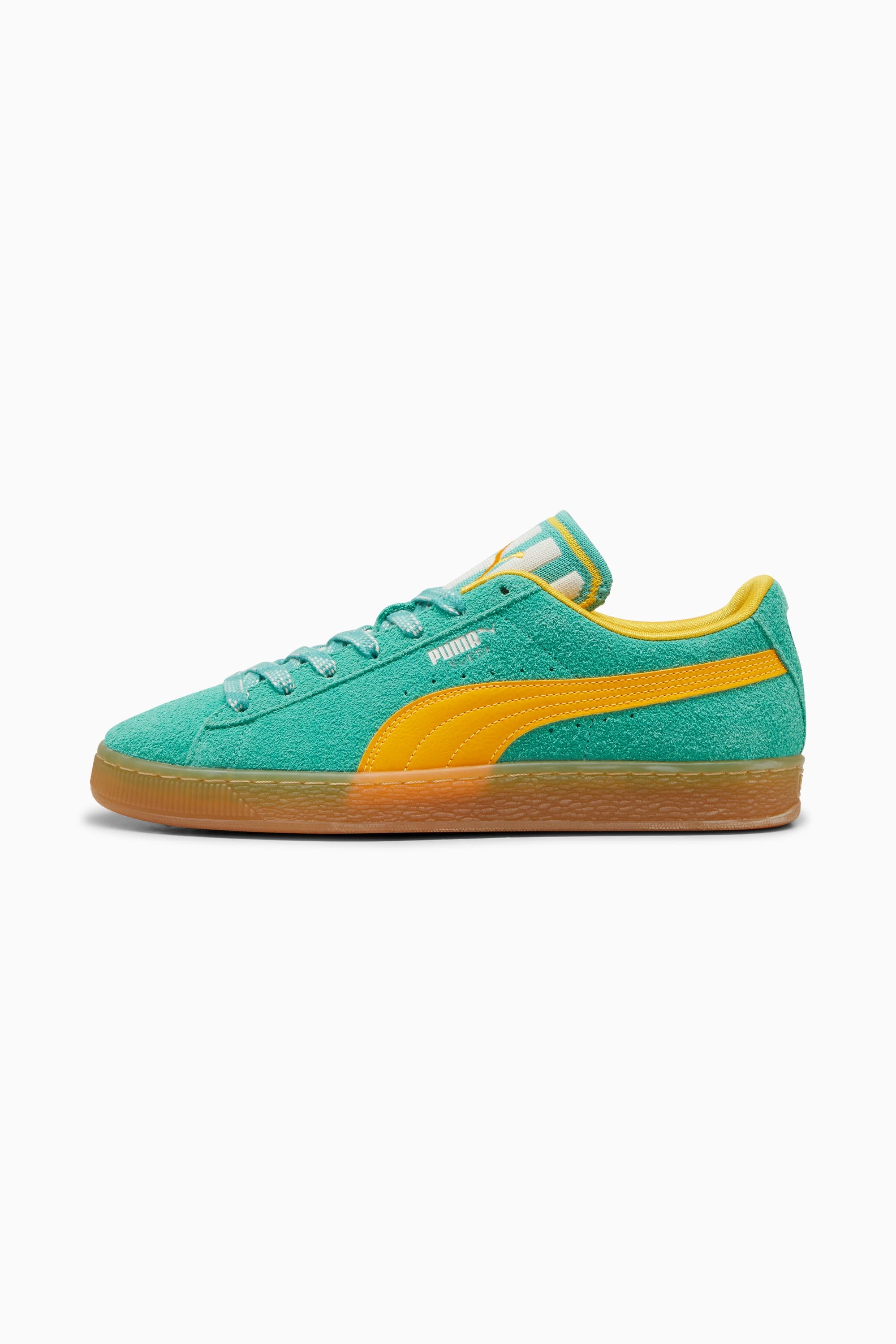 PRODUCT STORY The Suede hit the scene in 1968 and has been changing the game ever since. It's been worn by icons of every generation, and it's stayed classic through it all. Instantly recognizable and constantly reinvented, Suede's legacy continues to grow and be legitimised by the authentic and expressive individuals that embrace the iconic shoe. This Supertifo version features a hairy suede upper, speckled laces, and a bold tongue design. FEATURES & BENEFITS - PUMA's leather products support responsible manufacturing via the Leather Working Group: www.leatherworkinggroup.com DETAILS - Style: 398810_01 - Color: Jade Frost-Gum - Regular fit - Hairy suede upper - Hairy suede overlays - Textile lining - Speckled laces, with hairy suede lace loop - Rubber midsole and outsole - Synthetic PUMA Formstrip and FOT - Textile tongue with striped design and PUMA Cat embroidery - PUMA branding details MATERIAL INFORMATION - Sockliner: 100% Textile - Outsole: 100% Rubber - Upper: 80.83% Leather - cow, 19.17% Synthetic - Lining: 100% Textile