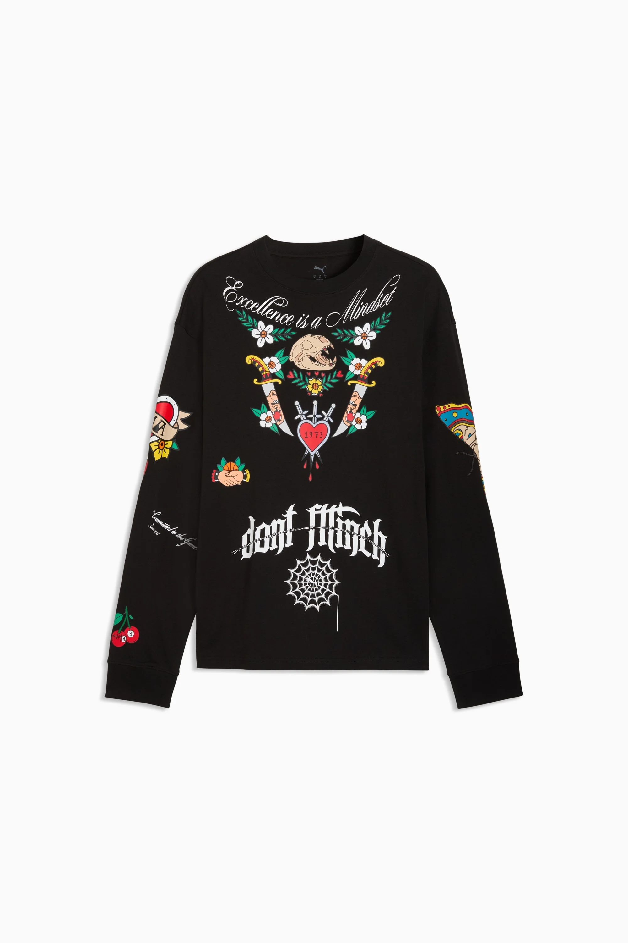 PRODUCT STORY Step into the world of Swish and Ink - a basketball collection that fuses bold, ink-inspired graphics with game-ready style. From roses and script to illustrated motifs, each piece is crafted for players who bring art and attitude to every move. FEATURES & BENEFITS - Made with at least 20% recycled cotton. DETAILS - Style: 634664_01 - Color: PUMA Black - Fit: Oversized - Main material type: Single jersey - Neck: Crew neck - Long sleeves - Length: Regular