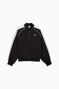 PRODUCT STORY The T7 tracksuit made its debut in 1968 and has been changing the game ever since. With its signature side panels, clean cutlines, and unmistakable PUMA DNA, the T7 has achieved icon status. This season we’ve amplified the classic with a bold colour palette, a range of relaxed and cropped fits, and an oversized PUMA Cat Logo for extra attitude. A generous cut and PUMA RESORT branding give this bomber jacket standout style. FEATURES & BENEFITS - Made with at least 50% recycled materials. DETAILS - Style: 635022_01 - Color: PUMA Black - Fit: Oversized - Main material type: Plain weave - Neck: Collar - Long sleeves - Fastener: Full zip - Length: Regular - Pockets: Seam pocket MATERIAL INFORMATION - Inserts: 100% polyester - Lining: 100% polyester - Shell: 100% nylon - Filling: 100% polyester - Rib: 94% cotton, 6% elastane