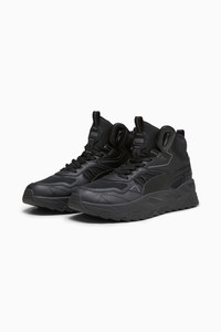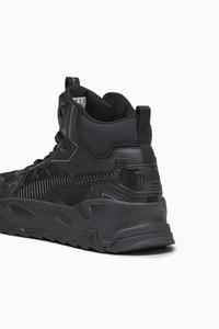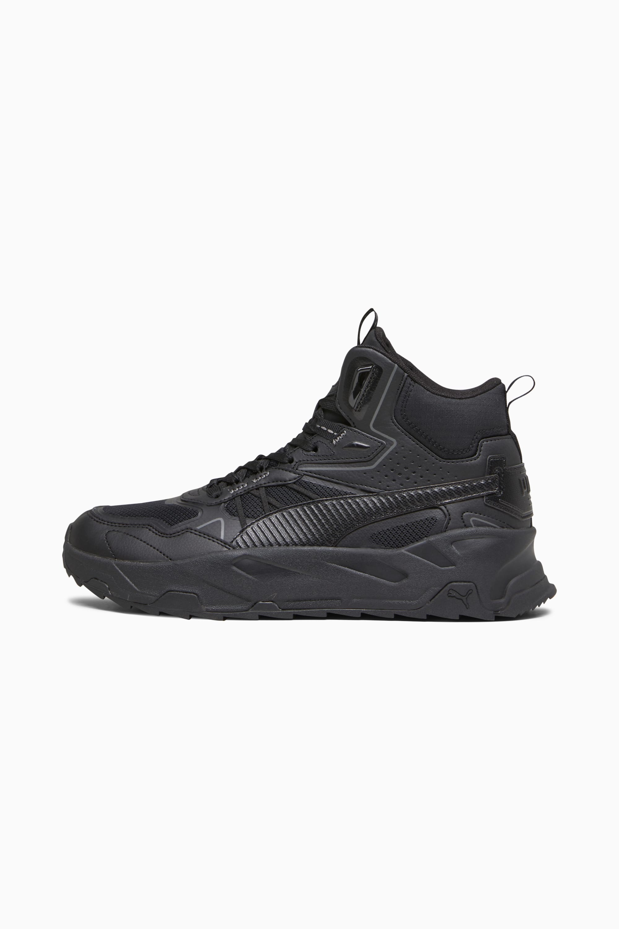 PRODUCT STORY Introducing the Trinity Mid Hybrid, a mid-boot sneaker inspired by adventures in the great outdoors. The mixed material upper layers mesh, nylons, nubuck and synthetics, with webbing and stitching elements linking back to the hiking trends of the moment. FEATURES & BENEFITS - CMEVA: PUMA's compression-moulded EVA material for lightweight performance - Recyled Material: The upper of this shoe is made with at least 30% recycled materials and the bottom is made with at least 10% recycled materials, as a step toward a better future DETAILS - Style: 392327_01 - Color: PUMA Black-PUMA Black-Cool Dark Gray - Mid-boot construction - Mixed material upper - CMEVA midsole - Rubber outsole - PUMA Formstrip on the medial and lateral sides - PUMA Wordmark on the heel MATERIAL INFORMATION - Sockliner: 100% Textile - Outsole: 100% Rubber - Upper: 68.21% Synthetic, 31.79% Textile - Lining: 100% Textile