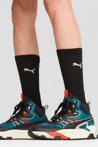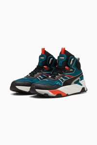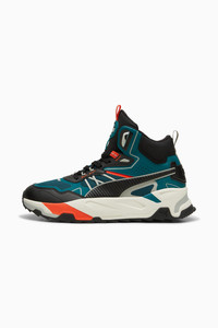 PRODUCT STORY Introducing the Trinity Mid Hybrid, a mid-boot sneaker inspired by adventures in the great outdoors. The mixed material upper layers mesh, nylons, nubuck and synthetics, with webbing and stitching elements linking back to the hiking trends of the moment. FEATURES & BENEFITS - CMEVA: PUMA's compression-moulded EVA material for lightweight performance - Recyled Material: The upper of this shoe is made with at least 30% recycled materials and the bottom is made with at least 10% recycled materials, as a step toward a better future DETAILS - Style: 392327_05 - Color: Cold Green-PUMA Black-Smokey Gray-Redmazing - Mid-boot construction - Mixed material upper - CMEVA midsole - Rubber outsole - PUMA Formstrip on the medial and lateral sides - PUMA Wordmark on the heel MATERIAL INFORMATION - Sockliner: 100% Textile - Outsole: 100% Rubber - Upper: 68.21% Synthetic, 31.79% Textile - Lining: 100% Textile