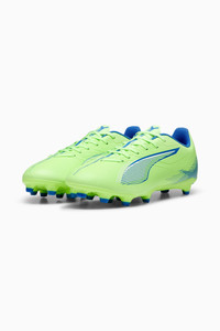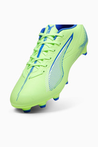 PRODUCT STORY How fast is ULTRA 5 PLAY? Fasten your seatbelt. Perfect for those who are just starting to fall in love with the beautiful game, this version of ULTRA comes with PUMA's brand-new SPEEDSYSTEM outsole and FastTrax stud design for the most optimal traction. These cleats have three rounded studs on the lateral side so you can switch between firm ground and artificial grass. Wherever you play, play at full throttle. FEATURES & BENEFITS - ACCELERATION: The SPEEDSYSTEM outsole design combines a high-performance fibre base material with a revolutionary stud system, maximising energy return for faster acceleration - TRACTION: PUMA's FastTrax studs are combined with more rounded studs on the lateral side for the most optimal traction on both firm ground and artificial grass - STABILITY: Debossed support frame designed to add stability to the lightweight upper - The upper of this shoe is made with at least 20% recycled materials DETAILS - Style: 107689_03 - Color: Fizzy Apple-PUMA White-Bluemazing - Lightweight synthetic upper material - SPEEDSYSTEM outsole - Regular to narrow fit - Low-cut regular tongue construction, fits various foot shapes - FG/AG: Suitable for use on firm or artificial surfaces MATERIAL INFORMATION - Sockliner: 100% Textile - Outsole: 100% Synthetic - Upper: 97.65% Synthetic, 2.35% Textile - Lining: 100% Textile