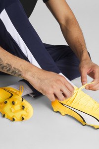PRODUCT STORY ULTRA – Just when they think you couldn’t get any faster – you do. With its fully reengineered, lightweight ULTRAWEAVE upper, the new ULTRA ULTIMATE Men's Soccer Cleats takes its signature speed and acceleration to the next level. The application of PWRTAPE draws from the anatomy of the human foot to provide natural support for quick changes of pace and direction. Running spike-inspired SPEEDPLATE makes it official: ULTRA is Too Fast for Them. FEATURES & BENEFITS - ULTRAWEAVE: Ultra-light, engineered fabric with a structured, 4-way stretch that reduces weight and friction - PWRTAPE: Targeted upper reinforcement for support and durability - The upper of this shoe is made with at least 20% recycled materials as a step toward a better future DETAILS - Style: 107311_04 - Color: Yellow Blaze-PUMA White-PUMA Black - ULTRAWEAVE upper material - Lightweight removable sockliner with NanoGrip technology keeps the foot from slipping inside the boot - Dual-density SPEEDPLATE outsole is inspired by PUMA track running spikes for next-level traction and propulsion - Lightweight Dynamic Motion System outsole enhances traction and agility for unpredictable changes of pace and direction. Suitable for use on both firm natural surfaces and artificial grass (4G). - Regular to narrow fit - FG/AG: Firm Ground/Artificial Ground MATERIAL INFORMATION - Sockliner: 100% Textile - Outsole: 100% Synthetic - Upper: 95.51% Synthetic, 4.49% Textile - Lining: 66.40% Textile, 33.60% Synthetic