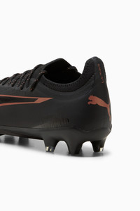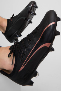 PRODUCT STORY Just when they think you couldn’t get any faster – you do. With its fully engineered, lightweight ULTRAWEAVE upper, ULTRA ULTIMATE takes its signature speed and acceleration to the next level. The application of PWRTAPE draws from the anatomy of the human foot to provide natural support for quick changes of pace and direction. Dual-density SPEEDPLATE makes it official: ULTRA is Too Fast for Them. FEATURES & BENEFITS - The upper of this shoe is made with at least 20% recycled materials as a step toward a better future - ULTRAWEAVE: Ultra-light, engineered fabric with a structured, 4-way stretch that reduces weight and friction. Built for athletes looking to increase speed and strength - PWRTAPE: Targeted upper reinforcement for support and durability DETAILS - Style: 107744_02 - Color: PUMA Black-Copper Rose - Minimum weight for maximum speed with the re-engineered high-performance ULTRAWEAVE upper material - PWRTAPE provides natural support and stability for quick changes of pace and direction - Lightweight removable sockliner with NanoGrip technology keeps the foot from slipping inside the cleat - Dual-density SPEEDPLATE outsole for next-level traction and propulsion - FG/AG: Firm ground/Artificial ground outsole - Regular to narrow fit MATERIAL INFORMATION - Sockliner: 100% Textile - Outsole: 100% Synthetic - Upper: 86.20% Synthetic, 13.80% Textile - Lining: 66.40% Textile, 33.60% Synthetic