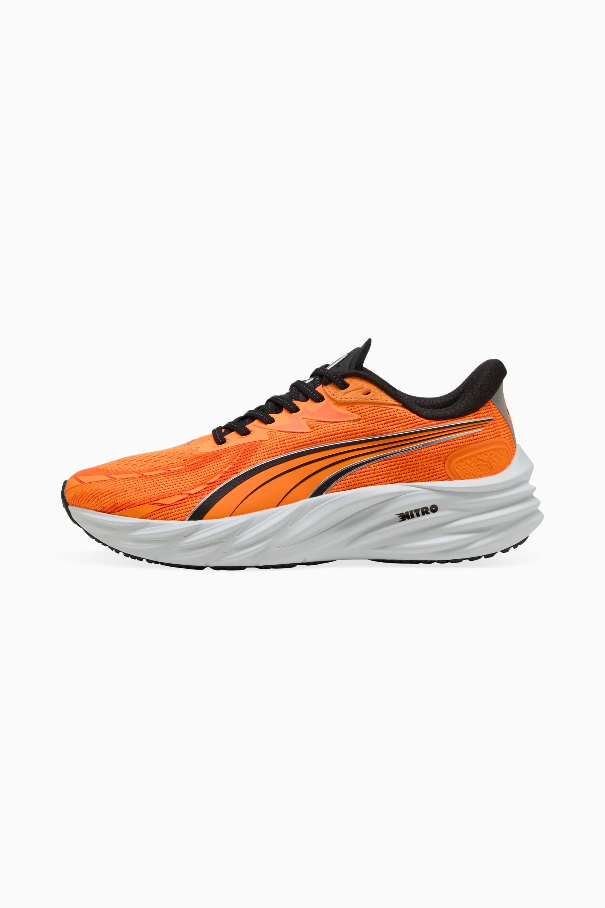 PRODUCT STORY Running feels different for everyone – and that's exactly how it should be. Whether you're chasing a personal record or just chasing the feeling, Velocity 4 is built to move with you. Any runner, any time, any distance, it can endure, perform, and exceed expectations. Our lightest Velocity yet features a full-length NITROFOAM™ midsole, improved breathability with new mesh in the upper, and a PUMAGRIP outsole for the best traction in the game. FEATURES & BENEFITS - BREATHABILITY: Premium engineered knit material engineered for breathability and stretch, reinforced with PWRTAPE for durability and lockdown - NITROFOAM™: Innovative nitrogen-infused foam technology that uses premium raw materials to provide maximum energy return - PUMAGRIP: Outsole is made of durable rubber compound for multi-surface traction - The upper of the shoes is made with at least 30% recycled materials. DETAILS - Style: 311140_09 - Color: Heat Fire-PUMA Black - Fit: Regular - Toe type: Rounded - Fastener: Laces - Heel type: Flat - Heel-to-toe drop: 10mm - Stack height 36mm / 26mm - Recommended for: neutral pronators MATERIAL INFORMATION - Sockliner: 100% Textile - Outsole: 100% Rubber - Upper: 59.73% Textile, 37.40% Synthetic, 2.87% Leather - cow - Lining: 100% Textile