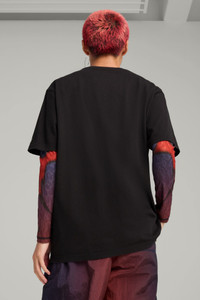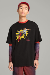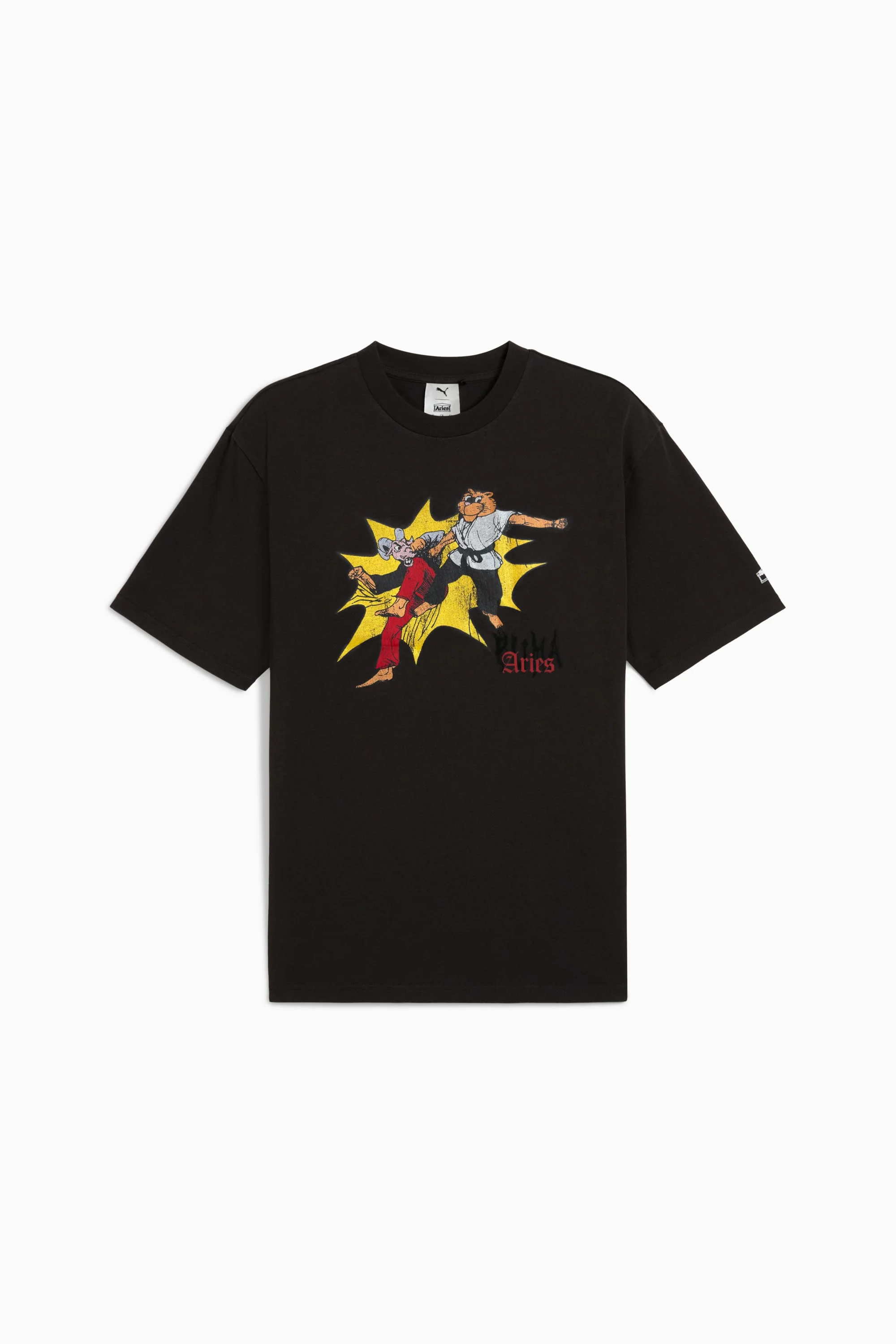 PRODUCT STORY Luxe-streetwear brand Aries is back with a new collection that combines their signature extravagance with PUMA’s heritage silhouettes. This collection is centered around the charged athleticism of Muay Thai as well as the danger and thrill of classic fighting games FEATURES & BENEFITS - Made with at least 20% recycled cotton DETAILS - Style: 629495_01 - Color: PUMA Black - Relaxed fit - Main material: Single jersey - Regular length - Crew neck - Short sleeves - This garment has been individually treated for a unique look. Follow washing instructions to help maintain your garment's one-of-a-kind-appeal - PUMA x ARIES co-branding details MATERIAL INFORMATION - Shell: 100% cotton - Rib: 70% cotton, 30% polyester