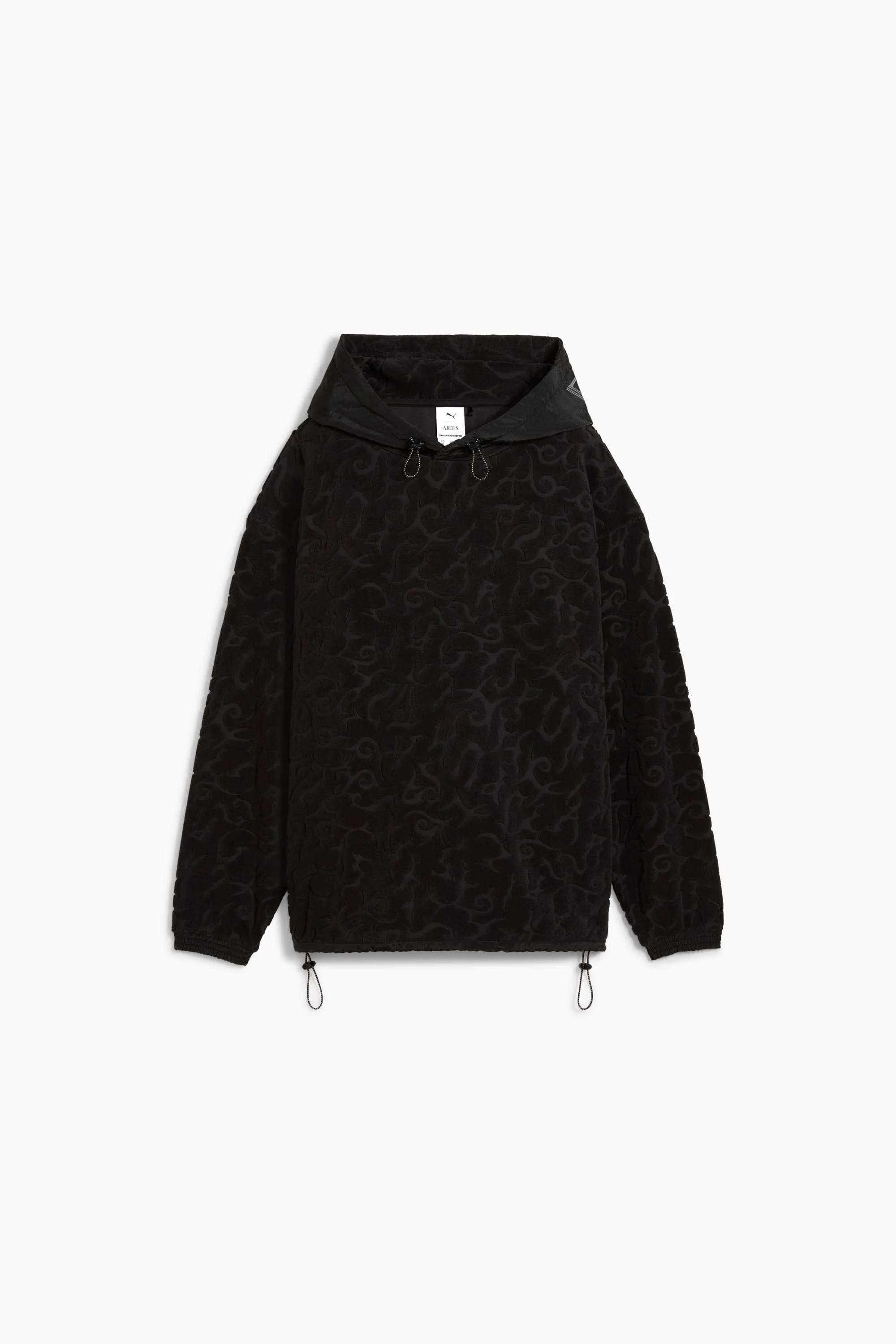 PRODUCT STORY Inspired by counterculture elements and the aesthetic qualities of mixed martial arts (MMA), this season of PUMA x ARIES ARISE embraces the inimitable spirit of Aries Arise. These looks feature bold graphics and injects sport embellishments in an effortless way. Part of the collab, this hoodie has a bungee drawcords at the hem and hood so you can adjust your fit. DETAILS - Style: 629494_01 - Color: PUMA Black - Oversized fit - Main material: 550gsm, French Terry - Elongated - Hood with bungee drawcord - Long sleeves - Hem with bungee drawcord for customisable fit - PUMA x ARIES ARISE co-branding details MATERIAL INFORMATION - HOOD: 100% nylon - Shell: 83% cotton, 14% polyester, 3% elastane - Pocket Bag: 100% cotton - Overlay: 100% nylon - TOP WAISTBAND: 100% nylon